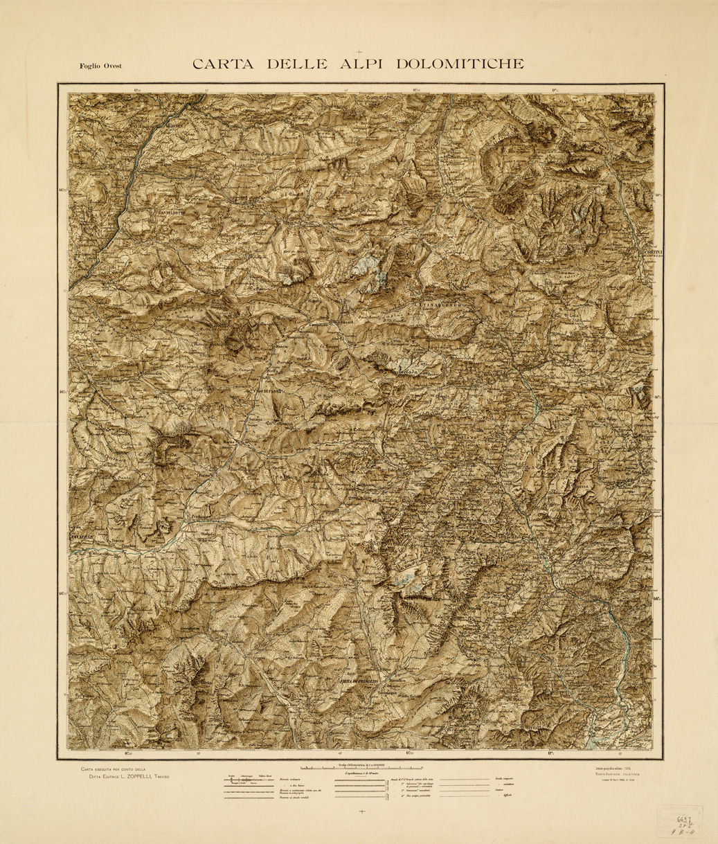 "Rappresentazione orografica a curve di livello e a sfumo l'equidistanza è di 50 metri. In basso la legenda delle strade. I.G.M. (FI). Carta eseguita per conto della Ditta Editrice L. Zoppelli,Treviso."