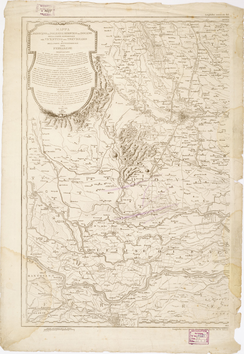 "...INDIVIDUATA DI TUTTE LE CITTA', TERRE POPOLATE E CASTELLI, ECC., ECC., CORREDATA DI TUTTE LE GRANDIOSE E STUPENDE OPERAZIONI ESEGUITE SOPRA I FIUMI E SUL MARE CON SOSTEGNI IDRAULICI, RETTIFILI DE' FIUMI, CANALI, ECC., ECC., RETTIFICATA MEDIANTE LE OSSERVAZIONI FATTE SOPRA I LUOGHIPIU' RIMARCABILI E I TRIANGOLI DA QUELLI DEDOTTI FURONO COL MEZZO DEL CALCOLO RIPORTATI ALLA MERIDIANA DELLA SPECOLA DI PADOVA E ALLA SUA NORMALE, ECC., ECC., DA GIOVANNI VALLE 1810. VENEZIA. La stessa carta di cui al n. 49 d'ordine (Collez. Bianconi n. 138) in due fogli incisi su rame da P. Zuliani."