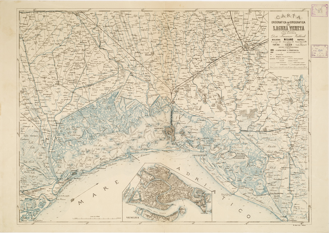 "Rappresentazione orografica planimetrica. I numeri indicanti le sonde nella laguna e nel mare sono espressi in metri. Sotto il titolo vi sono i segni convenzionali. In basso è presente la pianta della città di Venezia. R. Gast. inc., Milano. Casa Editrice Dott. Francesco Vallardi."