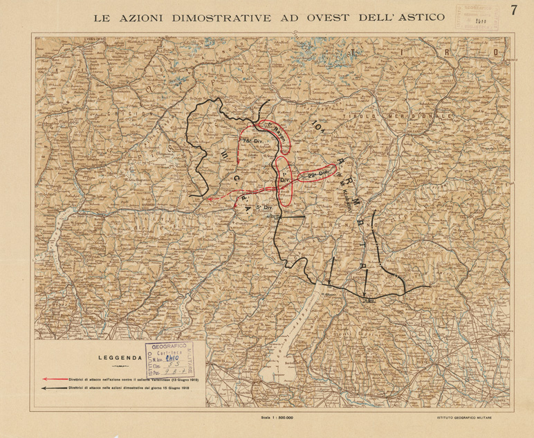 DISLOCAZIONE DELLE FORZE CONTRAPPOSTE SULLA FRONTE DI BATTAGLIA ALL'ALBA DEL 15 GIUGNO 1918 - Foglio 7 - LE AZIONI DIMOSTRATIVE AD OVEST DELL' ASTICO