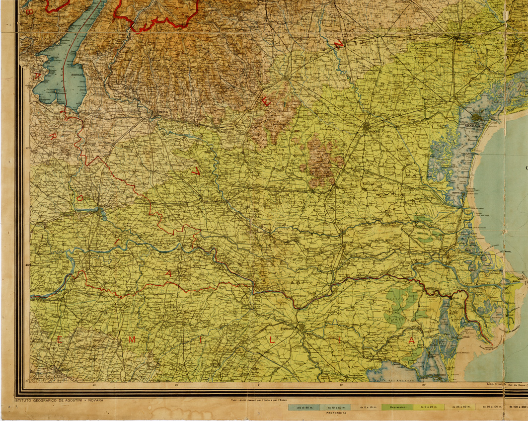 "Rappresentazione orografica a tinte ipsometriche. In basso è presente la scala delle tinte. Istituto Geografico De Agostini, Novara."