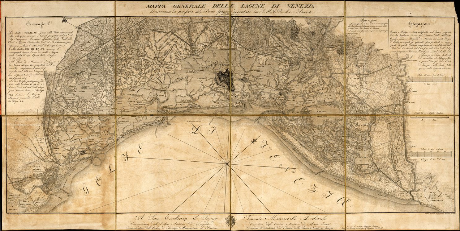 "...DIMOSTRANTE LA PERIFERIA DEL PORTO-FRANCO ACCORDATO DA S.M.I.R.A. CON DECRETO 20 FEBBRAIO 1829. Incisione su rame di Dionisio Moretti su disegno di B. Combatti, dedicata al Ten. Maresciallo Dedovich. Una nota a destra in alto avverte che la carta è stata "rettificata sul Piano eseguito dal Sig. Ingegnere Lessau". Segue in basso la data originale della carta: "Venezia li 28 feb. 1818". Orientazione nord a destra. Sono rappresentati strade, canali, coltivazioni, ecc. Tre scale grafiche in tese di Parigi, miglia d'Italia e in metri. Due copie montate su tela a stacchi in foglio unico. La copia Collez. Pasqui n. 9 è piegata e contenuta in libretto. Cfr. MARINELLI, Saggio, ecc., n. 1499. La medesima carta è alla collezione Bianconi n. 124."