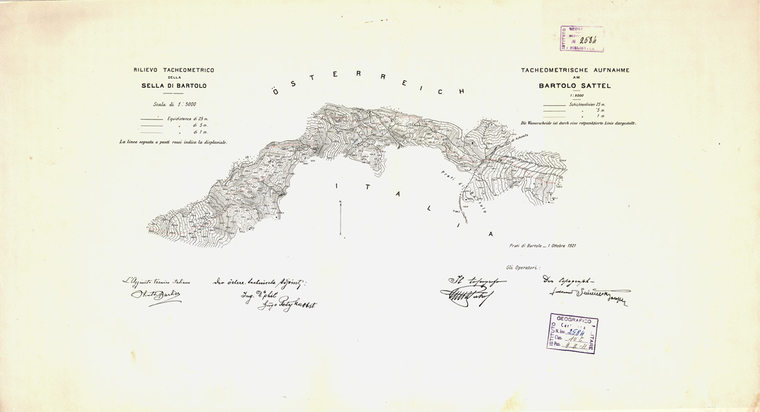 "Un foglio con orografia dimostrata a curve di livello (equidistanza di 25, 5, 1 m.). Una linea segnata a punti rossi indica la displuviale. In basso le firme degli operatori italiani e austriaci."