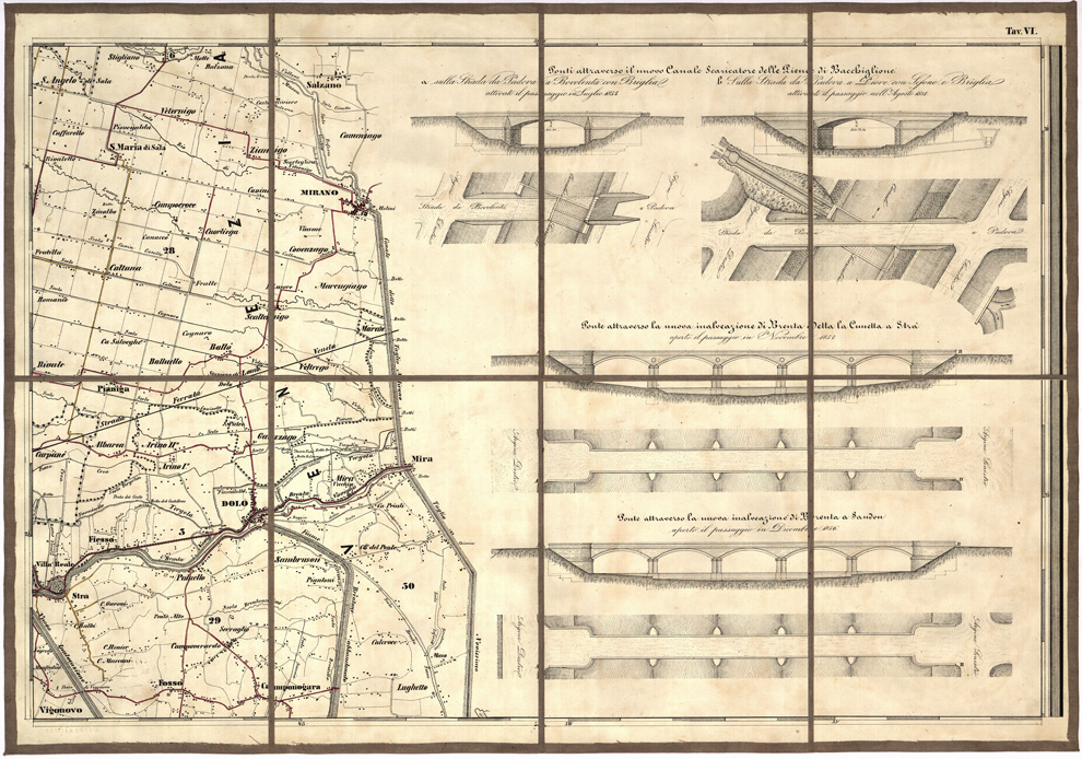 "...E DEI TERRENI CHE SI ESTENDONO FINO ALLA SINISTRA SPONDA DEL FIUME ADIGE E LA LAGUNA DI CHIOGGIA. DELINEATA DA ORAZIO MORELLO SOTTO LA DIREZIONE DEL R. INGEGNERE IN CAPO VINCENZO BOGNOLO SULLA BASE DI QUELLA DELL'ISTITUTO GEOGRAFICO, DELLE MAPPE CENSUARIE CONSORZIALI, DELLE PLANIMETRIE ESISTENTI PRESSO L'UFFICIO PROVINCIALE DELLE PUBBLICHE COSTRUZIONI, E DI LOCALI RILIEVI. DEDICATA ALLA CONGREGAZIONE PROVINCIALE DI PADOVA CHE INCORAGGIO' L'OPERA. Carta in dodici fogli in litografia montati su tela. Carta ricca di dettagli e assai nitida. Rappresentazione orografica a tratteggio. Il foglio n. 1 contiene il titolo, il quadro d'unione e la leggenda dei segni convenzionali i fogli n. 3, 6, 9 contengono i disegni dei principali sostegni e manufatti idraulici il foglio n. 4 contiene i prospetti statistico-amministrativi i fogli n. 11 e 12 contiene cenni sui lavori di sistemazione di Brenta e Bacchiglione. Guglielmo Seiffert inc. Prem. Lit. P. Prosperini. Carta analoga a quella al numero d'ordine 141 cartella d'archivio n. 59 documento 31."