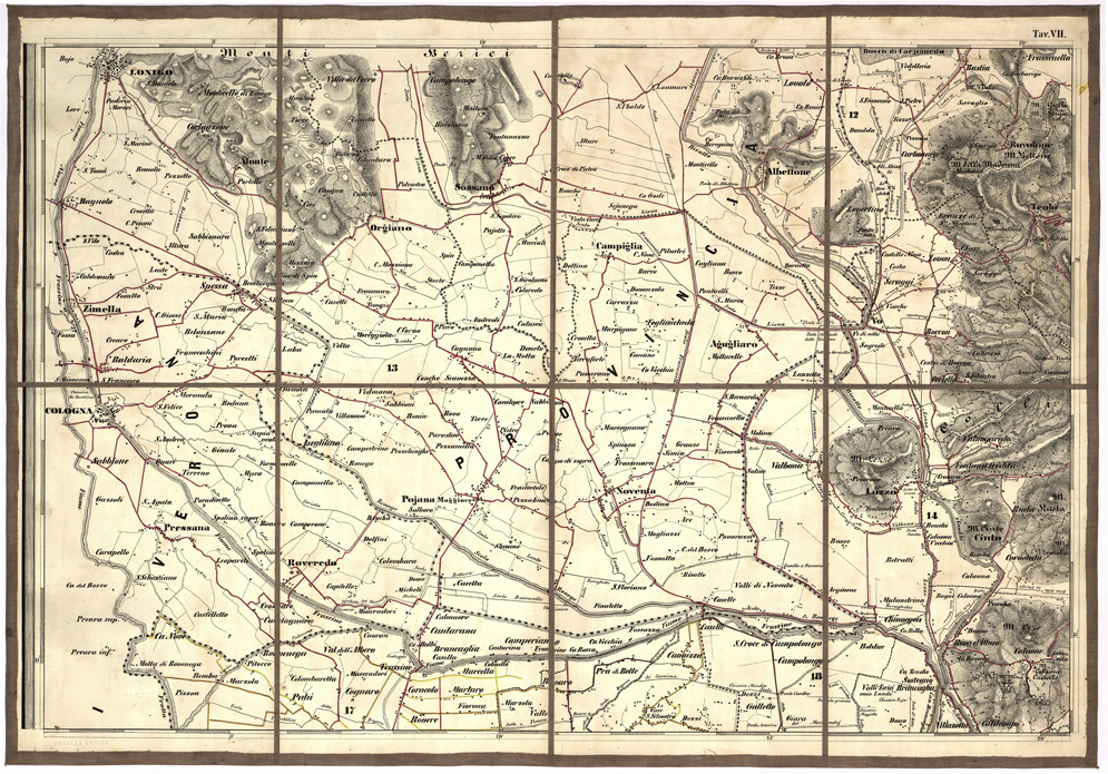 "...E DEI TERRENI CHE SI ESTENDONO FINO ALLA SINISTRA SPONDA DEL FIUME ADIGE E LA LAGUNA DI CHIOGGIA. DELINEATA DA ORAZIO MORELLO SOTTO LA DIREZIONE DEL R. INGEGNERE IN CAPO VINCENZO BOGNOLO SULLA BASE DI QUELLA DELL'ISTITUTO GEOGRAFICO, DELLE MAPPE CENSUARIE CONSORZIALI, DELLE PLANIMETRIE ESISTENTI PRESSO L'UFFICIO PROVINCIALE DELLE PUBBLICHE COSTRUZIONI, E DI LOCALI RILIEVI. DEDICATA ALLA CONGREGAZIONE PROVINCIALE DI PADOVA CHE INCORAGGIO' L'OPERA. Carta in dodici fogli in litografia montati su tela. Carta ricca di dettagli e assai nitida. Rappresentazione orografica a tratteggio. Il foglio n. 1 contiene il titolo, il quadro d'unione e la leggenda dei segni convenzionali i fogli n. 3, 6, 9 contengono i disegni dei principali sostegni e manufatti idraulici il foglio n. 4 contiene i prospetti statistico-amministrativi i fogli n. 11 e 12 contiene cenni sui lavori di sistemazione di Brenta e Bacchiglione. Guglielmo Seiffert inc. Prem. Lit. P. Prosperini. Carta analoga a quella al numero d'ordine 141 cartella d'archivio n. 59 documento 31."