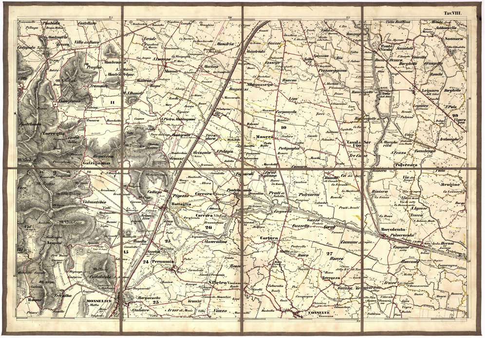 "...E DEI TERRENI CHE SI ESTENDONO FINO ALLA SINISTRA SPONDA DEL FIUME ADIGE E LA LAGUNA DI CHIOGGIA. DELINEATA DA ORAZIO MORELLO SOTTO LA DIREZIONE DEL R. INGEGNERE IN CAPO VINCENZO BOGNOLO SULLA BASE DI QUELLA DELL'ISTITUTO GEOGRAFICO, DELLE MAPPE CENSUARIE CONSORZIALI, DELLE PLANIMETRIE ESISTENTI PRESSO L'UFFICIO PROVINCIALE DELLE PUBBLICHE COSTRUZIONI, E DI LOCALI RILIEVI. DEDICATA ALLA CONGREGAZIONE PROVINCIALE DI PADOVA CHE INCORAGGIO' L'OPERA. Carta in dodici fogli in litografia montati su tela. Carta ricca di dettagli e assai nitida. Rappresentazione orografica a tratteggio. Il foglio n. 1 contiene il titolo, il quadro d'unione e la leggenda dei segni convenzionali i fogli n. 3, 6, 9 contengono i disegni dei principali sostegni e manufatti idraulici il foglio n. 4 contiene i prospetti statistico-amministrativi i fogli n. 11 e 12 contiene cenni sui lavori di sistemazione di Brenta e Bacchiglione. Guglielmo Seiffert inc. Prem. Lit. P. Prosperini. Carta analoga a quella al numero d'ordine 141 cartella d'archivio n. 59 documento 31."