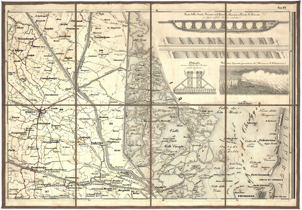 "...E DEI TERRENI CHE SI ESTENDONO FINO ALLA SINISTRA SPONDA DEL FIUME ADIGE E LA LAGUNA DI CHIOGGIA. DELINEATA DA ORAZIO MORELLO SOTTO LA DIREZIONE DEL R. INGEGNERE IN CAPO VINCENZO BOGNOLO SULLA BASE DI QUELLA DELL'ISTITUTO GEOGRAFICO, DELLE MAPPE CENSUARIE CONSORZIALI, DELLE PLANIMETRIE ESISTENTI PRESSO L'UFFICIO PROVINCIALE DELLE PUBBLICHE COSTRUZIONI, E DI LOCALI RILIEVI. DEDICATA ALLA CONGREGAZIONE PROVINCIALE DI PADOVA CHE INCORAGGIO' L'OPERA. Carta in dodici fogli in litografia montati su tela. Carta ricca di dettagli e assai nitida. Rappresentazione orografica a tratteggio. Il foglio n. 1 contiene il titolo, il quadro d'unione e la leggenda dei segni convenzionali i fogli n. 3, 6, 9 contengono i disegni dei principali sostegni e manufatti idraulici il foglio n. 4 contiene i prospetti statistico-amministrativi i fogli n. 11 e 12 contiene cenni sui lavori di sistemazione di Brenta e Bacchiglione. Guglielmo Seiffert inc. Prem. Lit. P. Prosperini. Carta analoga a quella al numero d'ordine 141 cartella d'archivio n. 59 documento 31."