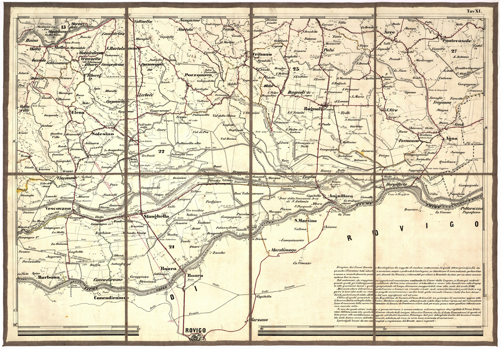 "...E DEI TERRENI CHE SI ESTENDONO FINO ALLA SINISTRA SPONDA DEL FIUME ADIGE E LA LAGUNA DI CHIOGGIA. DELINEATA DA ORAZIO MORELLO SOTTO LA DIREZIONE DEL R. INGEGNERE IN CAPO VINCENZO BOGNOLO SULLA BASE DI QUELLA DELL'ISTITUTO GEOGRAFICO, DELLE MAPPE CENSUARIE CONSORZIALI, DELLE PLANIMETRIE ESISTENTI PRESSO L'UFFICIO PROVINCIALE DELLE PUBBLICHE COSTRUZIONI, E DI LOCALI RILIEVI. DEDICATA ALLA CONGREGAZIONE PROVINCIALE DI PADOVA CHE INCORAGGIO' L'OPERA. Carta in dodici fogli in litografia montati su tela. Carta ricca di dettagli e assai nitida. Rappresentazione orografica a tratteggio. Il foglio n. 1 contiene il titolo, il quadro d'unione e la leggenda dei segni convenzionali i fogli n. 3, 6, 9 contengono i disegni dei principali sostegni e manufatti idraulici il foglio n. 4 contiene i prospetti statistico-amministrativi i fogli n. 11 e 12 contiene cenni sui lavori di sistemazione di Brenta e Bacchiglione. Guglielmo Seiffert inc. Prem. Lit. P. Prosperini. Carta analoga a quella al numero d'ordine 141 cartella d'archivio n. 59 documento 31."