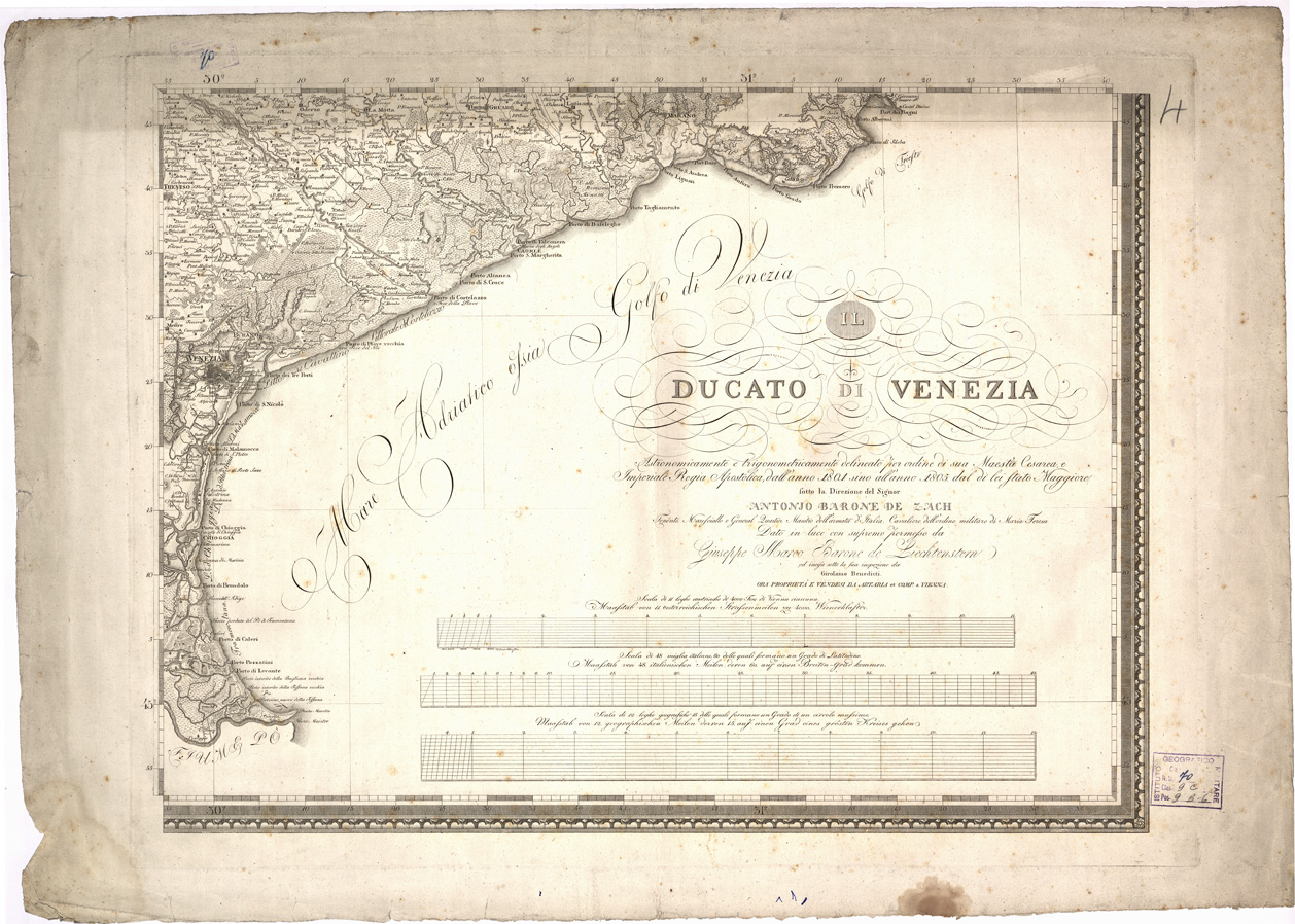 "...ASTRONOMICAMENTE E TRIGONOMETRICAMENTE DELINEATO PER ORDINE DI SUA MAESTA' CESAREA E IMPERIALE REGIA APOSTOLICA, DALL'ANNO 1801 ALL'ANNO 1805 DAL DI LEI STATO MAGGIORE SOTTO LA DIREZIONE DEL SIGNOR ANTONIO BARONE DE ZACH TENENTE MARESCIALLO E GENERAL QUARTIER MAESTRO DELL'ARMATA D'ITALIA, CAVALIERE DELL'ORDINE MILITARE DI MARIA TERESA. DATO IN LUCE CON SUPREMO PERMESSO DA GIUSEPPE MARCO BARONE DE LIECHTENSTEIN ED INCISA SOTTO LA SUA ISPEZIONE DA GIROLAMO BENEDICTI, ORA PROPRIETA' E VENDESI DA ARTARIA E COMP. A VIENNA. Questa carta, costruita per ordine dell'Austria, immediatamente dopo il trattato di Campoformio, è poggiata sui lavori trigonometrici condotti da Antonio de Zach dal 1798 al 1805 in varie riprese. La proiezione adottata è quella del Cassini con centro di sviluppo le coordinate dell'Osservatorio di Padova. Si compone di quattro fogli tratti da incisione su rame, stampati in nero. Essa "è la prima carta esatta e scientifica che sia stata eseguita per l'assieme delle provincie venete". (Cfr. MARINELLI G., Saggio, ecc., n. 1429). Essa mostra con grande accuratezza e ricchezze di particolari abitati, strade, sentieri, fiumi, torrenti, canali, ponti, porti, ecc. L'orografia è dimostrata a mezzo di un fine tratteggio a luce zenitale. Gli abitati sono distinti in base alla loro importanza. Limiti: nord, M.te Croce sud, Guastalla ovest, Lago di Garda est, Golfo di Trieste. Il foglio sud-orientale contiene il titolo in italiano e le scale grafiche in leghe austriache, miglia italiane, e leghe geografiche il foglio nord-occidentale contiene il titolo in tedesco. (Cfr. MORI A., La cartografia ufficiale in Italia e l'I.G.M., pagg. 49-50). Tre copie."