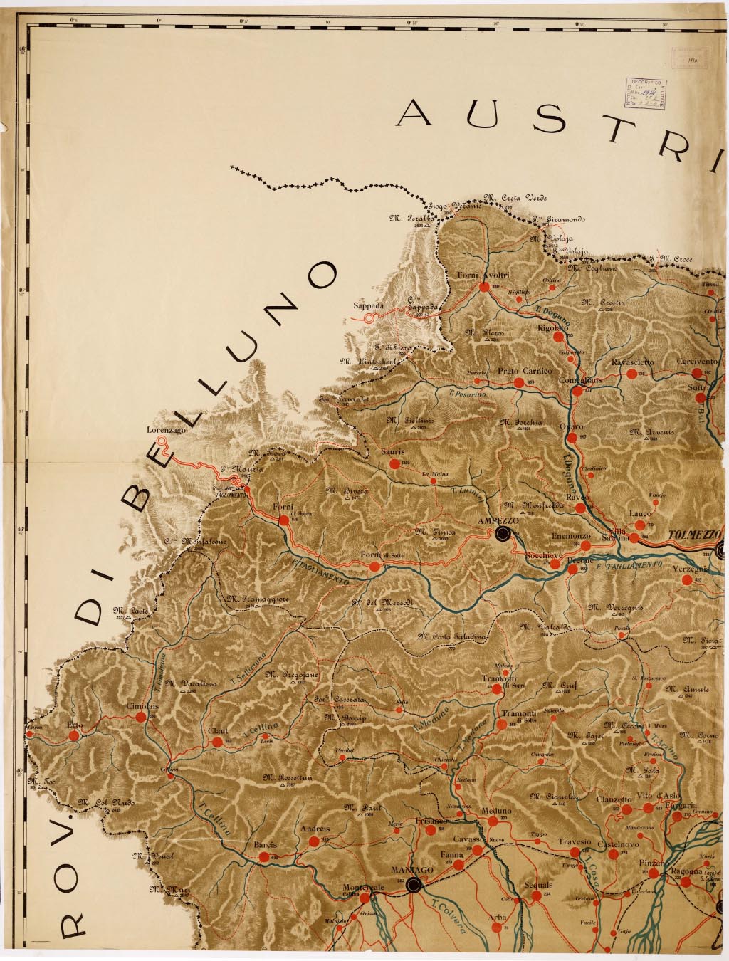 "Rappresentazione orografica a tratteggio. Carta in quattro fogli a colori. Nel foglio n. 2 è presente la tabella col censimento della popolazione nel 1911 e la superficie dei singoli Comuni in chilometri quadrati. Nel foglio n. 4 recasi la legenda dei segni convenzionali. Arti Grafiche A. P. Cantoni & C. Editori, Udine."