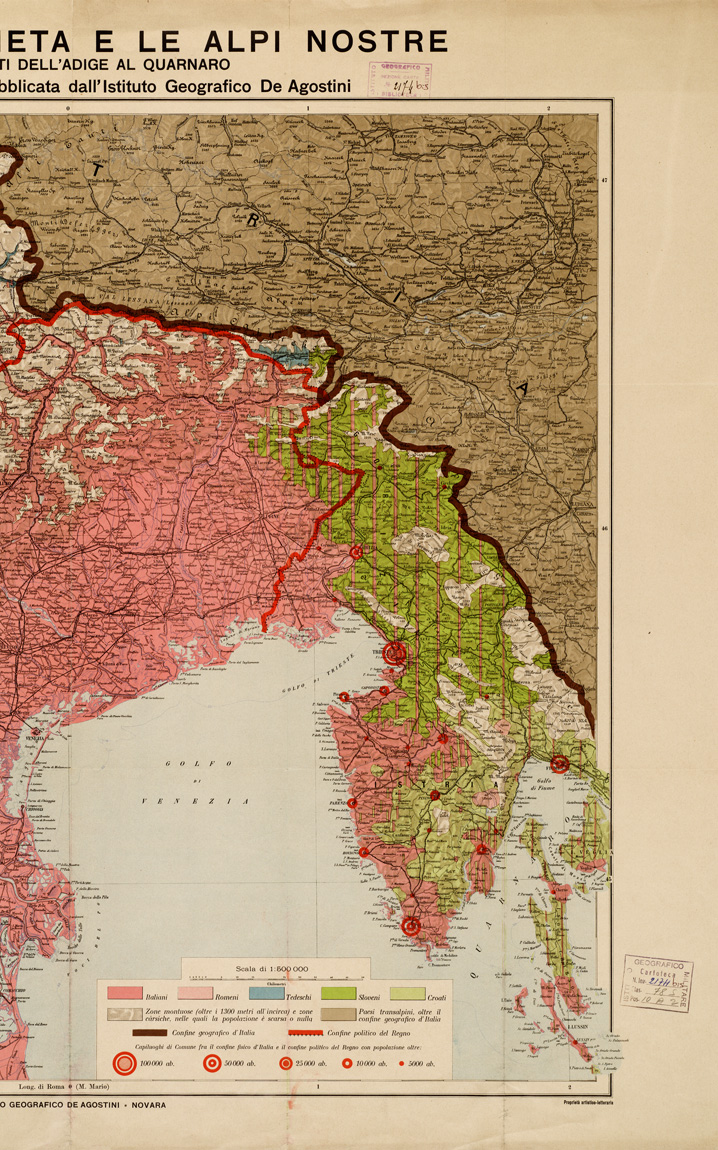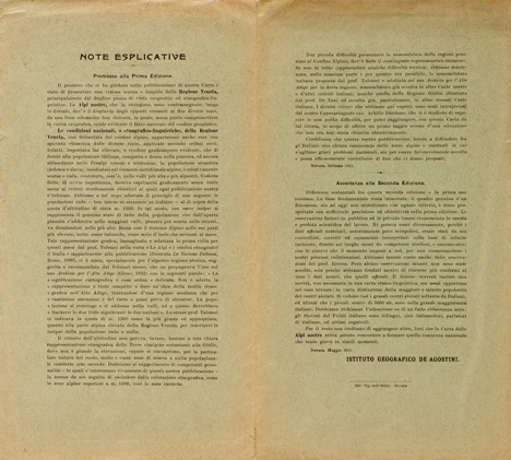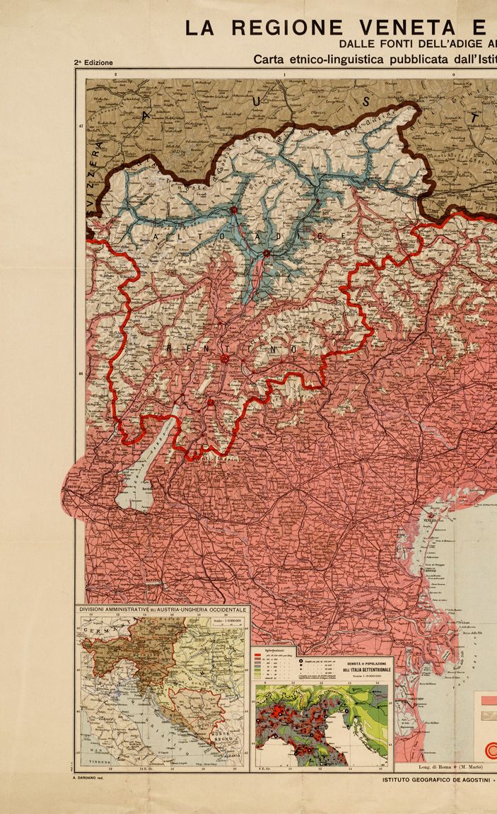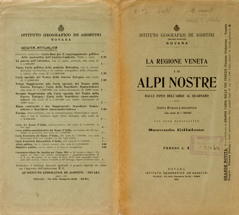 "PUBBLICATA DALL' ISTITUTO GEOGRAFICO DE AGOSTINI - NOVARA. Il documento è composto dalla carta e da un libretto esplicativo (fronte- retro). Esistenti quattro edizioni: n. d' inventario 2174 la prima edizione(1915) con libretto esplicativo n. d' inventario 2174 Bis la seconda edizione (1915) con libretto esplicativo n. d' inventario 2219 la quarta edizione (1917) con libretto esplicativo n. d' ordine 2219 Bis la quinta edizione. Rappresentazione orografica a sfumo. Un foglio redatto da A. Dardano. In basso a sinistra una cartina delle divisioni amministrative dell' Austria-Ungheria occidentale, e una dimostrante la densità di popolazione nell' Italia settentrionale."
