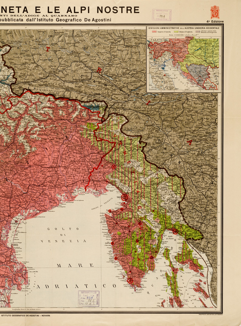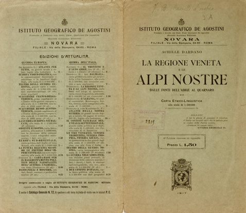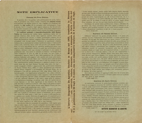 "PUBBLICATA DALL' ISTITUTO GEOGRAFICO DE AGOSTINI - NOVARA. Il documento è composto dalla carta e da un libretto esplicativo (fronte- retro). Esistenti quattro edizioni: n. d' inventario 2174 la prima edizione(1915) con libretto esplicativo n. d' inventario 2174 Bis la seconda edizione (1915) con libretto esplicativo n. d' inventario 2219 la quarta edizione (1917) con libretto esplicativo n. d' ordine 2219 Bis la quinta edizione. Rappresentazione orografica a sfumo. Un foglio redatto da A. Dardano."