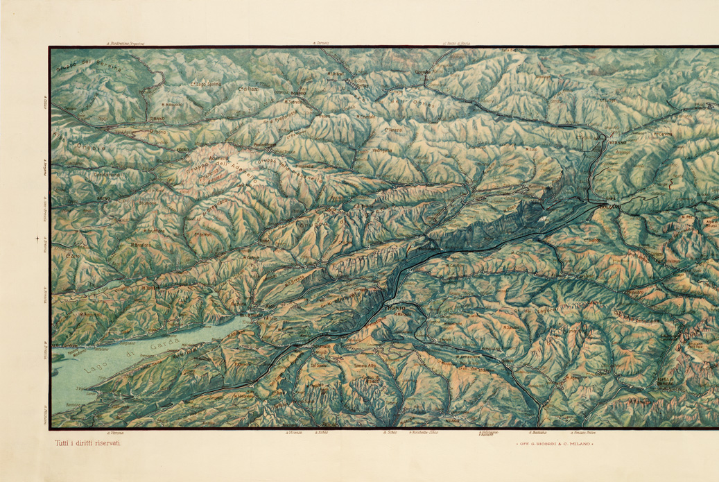"Carta panoramica. Dis. Prof. L. Pizzini Riva. Ed. Off. G. Ricordi e C. - Milano. La data è riportata a mano."
