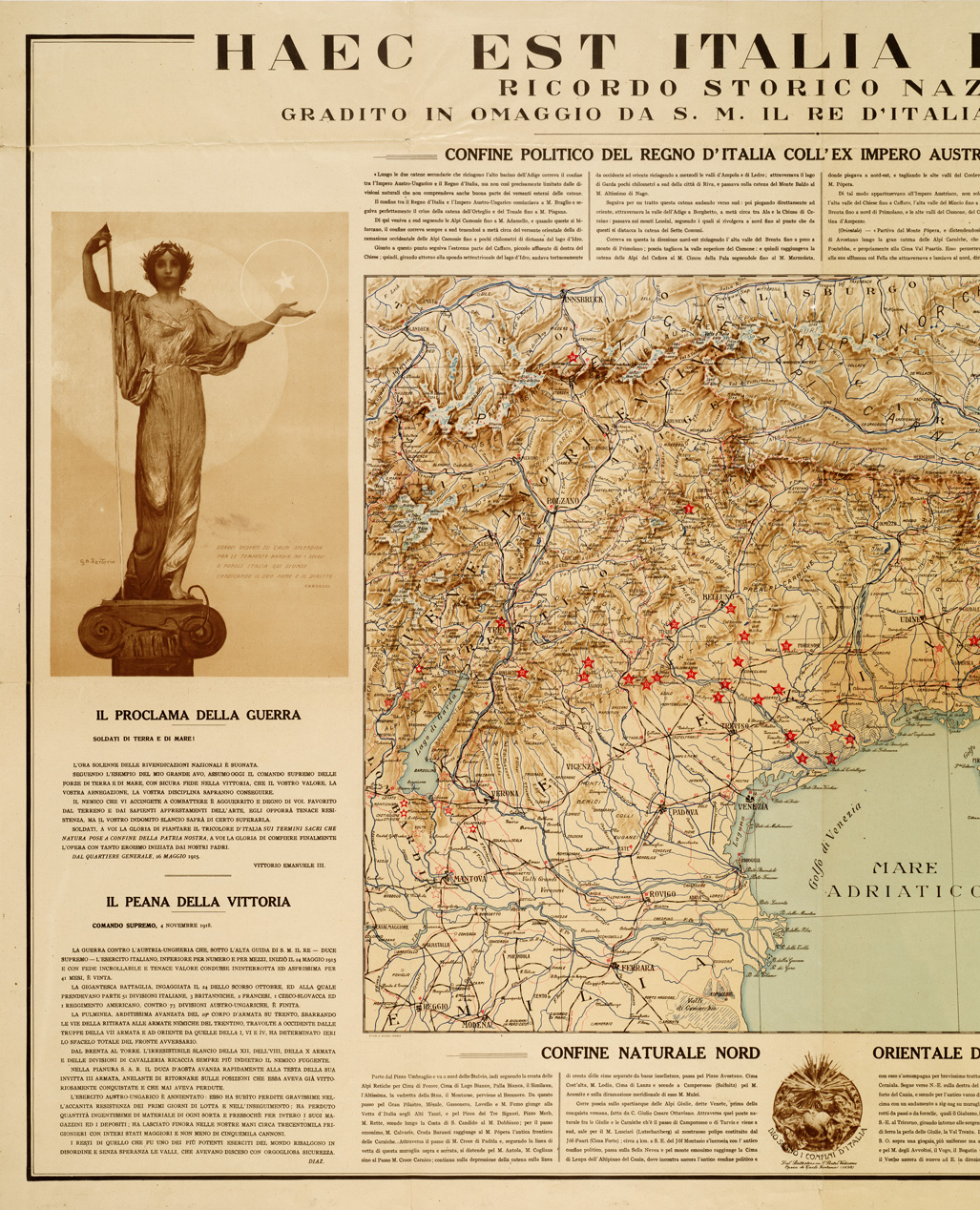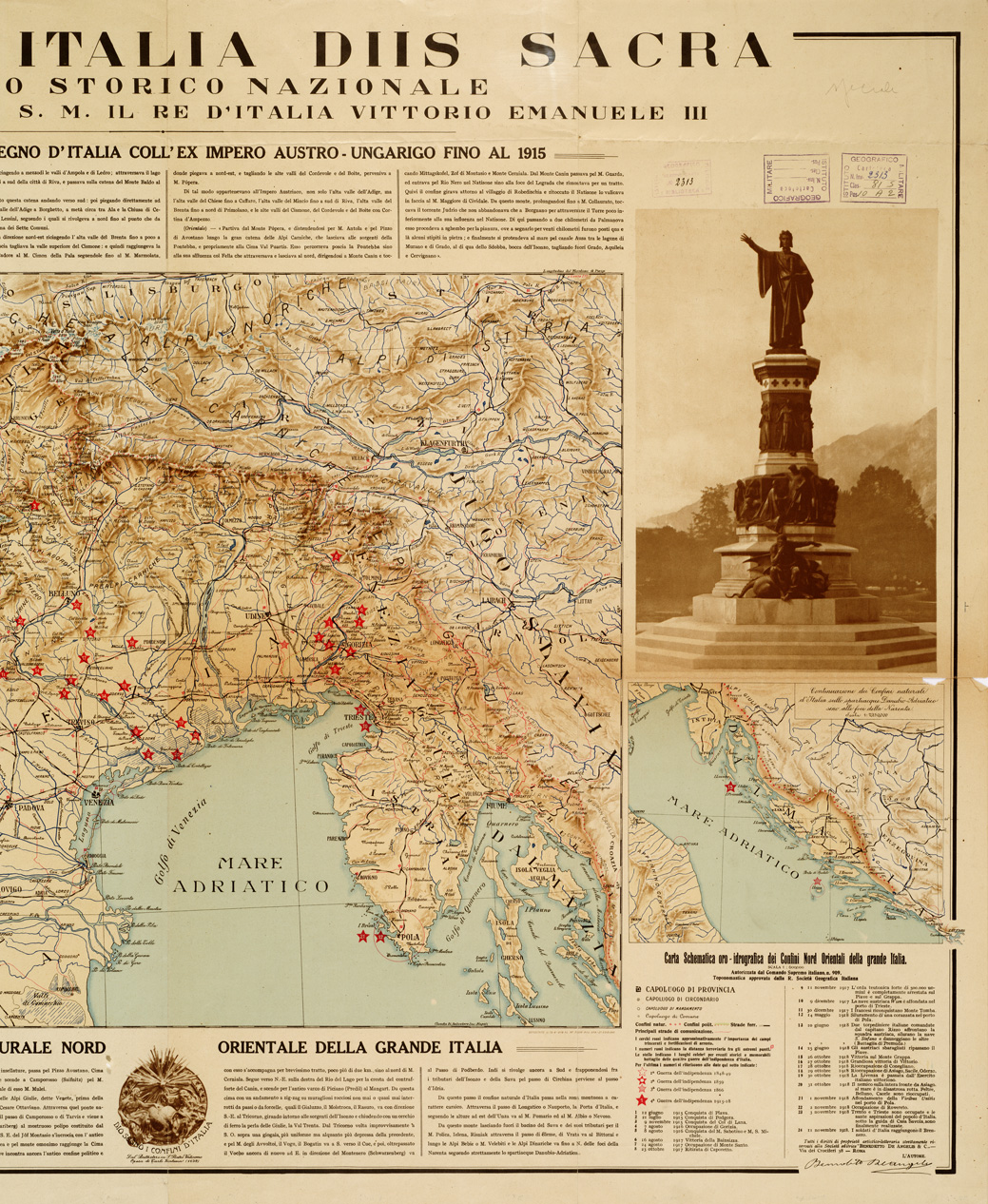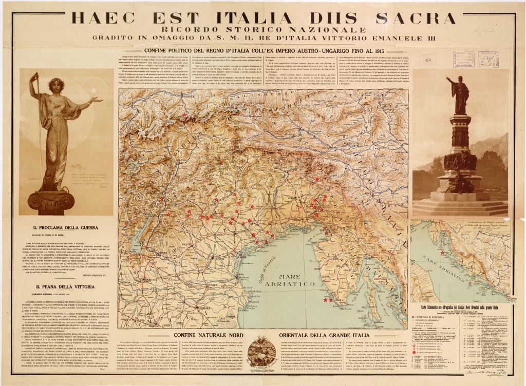 "Haec est Italia diis sacra. Ricordo storico nazionale. Gradito in omaggio da S. M. il Re d' Italia Vittorio Emanuele. Confine politico del Regno d' Italia coll' ex Impero Austo-Ungarico fino al 1915. Soc. Editrice Benedetto de Angelis - Roma. Rappresentazione orografica a sfumo."