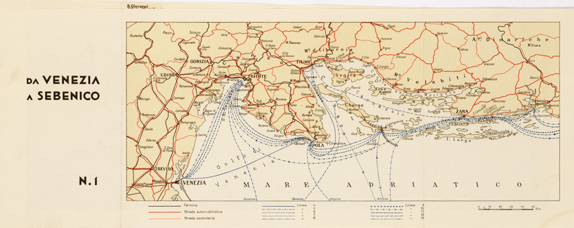 "Gruppo di tre carte con fronte e retro redatte dalla Compagnia Adriatica di Navigazione - Venezia. Descrizione dei tragitti via mare lungo la costa adriatica da Venezia (Italia) a S. Maura (Grecia). Sul fronte di ciascuna carta, immagine panoramica prospettica della zona sul retro, descrizione del tragitto percorso lungo la costa dalle motonavi. Del documento fa parte anche un libretto esplicativo con le immagini delle due motonavi della Compagnia Adriatica di Navigazione, gli orari e le relative informazioni sul servizio offerto."