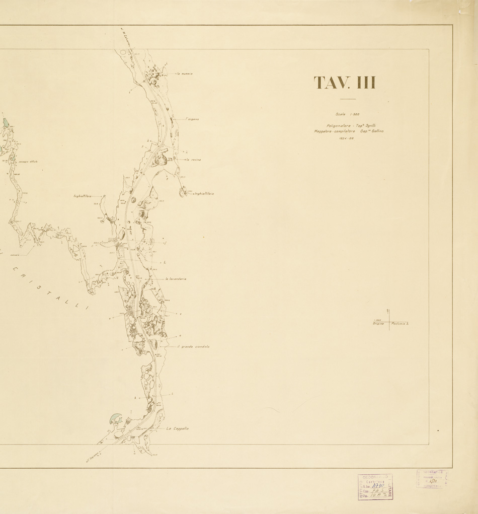"Documento composto da n.15 tavole. Al numero d' inventario 4730Bis documento composto da n.2 tavole dal titolo " Corso sotterraneo del Piuca nel versante di caccia ". Ed. R. Amministrazione delle Grotte -Postumia. Poligonatori: Top.fo Sgrilli mappatore e compilatore: Cap.no Gallino."
