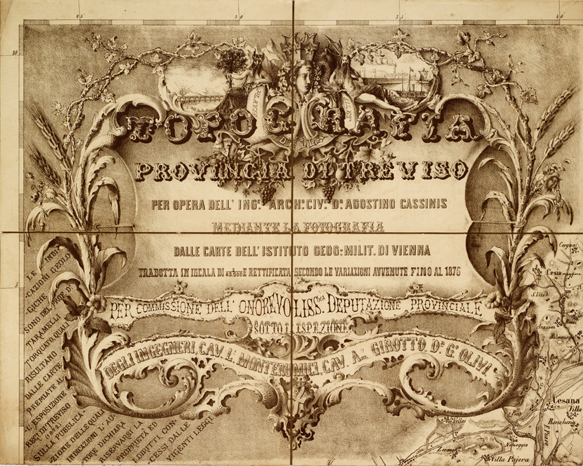 "...PER OPERA DELL' ING. ARCH. CIV. DR. AGOSTINO CASSINIS MEDIANTE LA FOTOGRAFIA DALLE CARTE DELL' IST. GEOGR. MILIT. DI VIENNA TRADOTTA IN SCALA DI 1:43.200 E RETTIFICATA SECONDO LE VARIAZIONI AVVENUTE FINO AL 1876. PER COMMISSIONE DELL' ONOREVOLISSIMA DEPUTAZIONE PROVINCIALE SOTTO L' ISPEZIONE DEGLI INGEGNERI CAV. L. MONTERUMICI, CAV. ANT. GIROTTO, DR. G. OLIVI. MILANO, B. MORAGLIA LIT. Carta in 16 fogli in litografia da ingrandimento fotografico della carta austriaca alla scala di 1:86.400. A seguito del titolo (foglio I) è detto: " Le indicazioni geologiche sono del Prof. Taramelli Torquato, quali risultano dalle carte premiate all' esposizione Reg. di Treviso (1872) sulla pubblicazione delle quali indicazioni l' autore dichiara riservarsi la proprietà ed i diritti concessi dalle vigenti leggi ". Il foglio n. 4 della carta è infatti una carta geologica a sè: esso reca il titolo " Topografia in scala di 1: 162.000 della Provincia di Treviso come quadro sinottico formante perte della Grande Carta Topografica dedotta fotograficamente come questa e mostra con segni e colori la serie cronogeologica ". Altre spiegazioni e notizie geologiche si trovano nei fogli n. 1 e n. 8. Il foglio n. 3 contiene la pianta di Treviso alla scala di 1:10.000 con elenco numerico degli edifici principali.I fogli n. 12 e n. 16 recano una " Tabella idrografica industriale della Provincia di Treviso ". I fogli sono contenuti entro una copertina sulla quale sono dati cenni informativi sulla costruzione della carta stessa. Annessi un quadro sinottico della Provincia di Treviso con dati statistico-amministrativi, un foglio con " Schiarimenti ad alcune voci mancanti nei comuni dizionari ed usate nell' illustrazione Geologica della Trevigiana " e una " Tabella delle principali qualità di pietre e terre esistenti in provincia di Treviso per usi d' arti ed industrie ". Stesso documento di appartenenza anche all' Arch. Cartografico n. 136 d' ordine - Cart. d' arch. n. 59 - Docum.n. 32. Rappresentazione orografica a tratteggio."