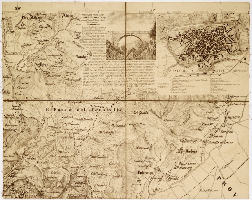 "...PER OPERA DELL' ING. ARCH. CIV. DR. AGOSTINO CASSINIS MEDIANTE LA FOTOGRAFIA DALLE CARTE DELL' IST. GEOGR. MILIT. DI VIENNA TRADOTTA IN SCALA DI 1:43.200 E RETTIFICATA SECONDO LE VARIAZIONI AVVENUTE FINO AL 1876. PER COMMISSIONE DELL' ONOREVOLISSIMA DEPUTAZIONE PROVINCIALE SOTTO L' ISPEZIONE DEGLI INGEGNERI CAV. L. MONTERUMICI, CAV. ANT. GIROTTO, DR. G. OLIVI. MILANO, B. MORAGLIA LIT. Carta in 16 fogli in litografia da ingrandimento fotografico della carta austriaca alla scala di 1:86.400. A seguito del titolo (foglio I) è detto: " Le indicazioni geologiche sono del Prof. Taramelli Torquato, quali risultano dalle carte premiate all' esposizione Reg. di Treviso (1872) sulla pubblicazione delle quali indicazioni l' autore dichiara riservarsi la proprietà ed i diritti concessi dalle vigenti leggi ". Il foglio n. 4 della carta è infatti una carta geologica a sè: esso reca il titolo " Topografia in scala di 1: 162.000 della Provincia di Treviso come quadro sinottico formante perte della Grande Carta Topografica dedotta fotograficamente come questa e mostra con segni e colori la serie cronogeologica ". Altre spiegazioni e notizie geologiche si trovano nei fogli n. 1 e n. 8. Il foglio n. 3 contiene la pianta di Treviso alla scala di 1:10.000 con elenco numerico degli edifici principali.I fogli n. 12 e n. 16 recano una " Tabella idrografica industriale della Provincia di Treviso ". I fogli sono contenuti entro una copertina sulla quale sono dati cenni informativi sulla costruzione della carta stessa. Annessi un quadro sinottico della Provincia di Treviso con dati statistico-amministrativi, un foglio con " Schiarimenti ad alcune voci mancanti nei comuni dizionari ed usate nell' illustrazione Geologica della Trevigiana " e una " Tabella delle principali qualità di pietre e terre esistenti in provincia di Treviso per usi d' arti ed industrie ". Stesso documento di appartenenza anche all' Arch. Cartografico n. 136 d' ordine - Cart. d' arch. n. 59 - Docum.n. 32. Rappresentazione orografica a tratteggio."