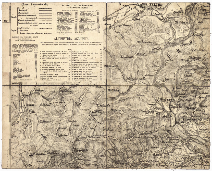 "...PER OPERA DELL' ING. ARCH. CIV. DR. AGOSTINO CASSINIS MEDIANTE LA FOTOGRAFIA DALLE CARTE DELL' IST. GEOGR. MILIT. DI VIENNA TRADOTTA IN SCALA DI 1:43.200 E RETTIFICATA SECONDO LE VARIAZIONI AVVENUTE FINO AL 1876. PER COMMISSIONE DELL' ONOREVOLISSIMA DEPUTAZIONE PROVINCIALE SOTTO L' ISPEZIONE DEGLI INGEGNERI CAV. L. MONTERUMICI, CAV. ANT. GIROTTO, DR. G. OLIVI. MILANO, B. MORAGLIA LIT. Carta in 16 fogli in litografia da ingrandimento fotografico della carta austriaca alla scala di 1:86.400. A seguito del titolo (foglio I) è detto: " Le indicazioni geologiche sono del Prof. Taramelli Torquato, quali risultano dalle carte premiate all' esposizione Reg. di Treviso (1872) sulla pubblicazione delle quali indicazioni l' autore dichiara riservarsi la proprietà ed i diritti concessi dalle vigenti leggi ". Il foglio n. 4 della carta è infatti una carta geologica a sè: esso reca il titolo " Topografia in scala di 1: 162.000 della Provincia di Treviso come quadro sinottico formante perte della Grande Carta Topografica dedotta fotograficamente come questa e mostra con segni e colori la serie cronogeologica ". Altre spiegazioni e notizie geologiche si trovano nei fogli n. 1 e n. 8. Il foglio n. 3 contiene la pianta di Treviso alla scala di 1:10.000 con elenco numerico degli edifici principali.I fogli n. 12 e n. 16 recano una " Tabella idrografica industriale della Provincia di Treviso ". I fogli sono contenuti entro una copertina sulla quale sono dati cenni informativi sulla costruzione della carta stessa. Annessi un quadro sinottico della Provincia di Treviso con dati statistico-amministrativi, un foglio con " Schiarimenti ad alcune voci mancanti nei comuni dizionari ed usate nell' illustrazione Geologica della Trevigiana " e una " Tabella delle principali qualità di pietre e terre esistenti in provincia di Treviso per usi d' arti ed industrie ". Stesso documento di appartenenza anche all' Arch. Cartografico n. 136 d' ordine - Cart. d' arch. n. 59 - Docum.n. 32. Rappresentazione orografica a tratteggio."