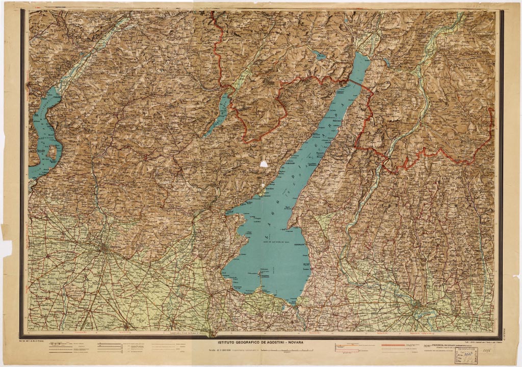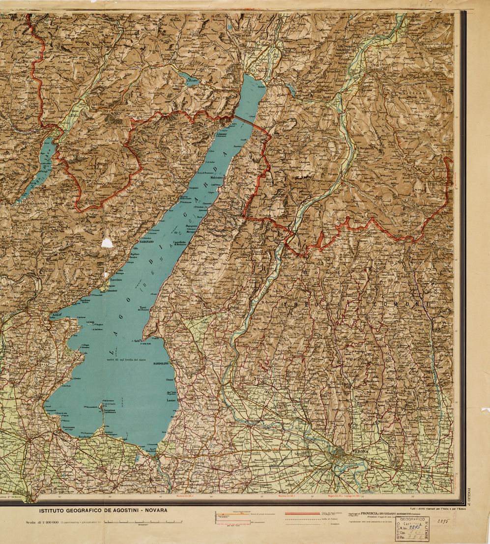 "Documento composto da n.2 fogli (parte 1 nord-parte 2 sud).Rappresentazione orografica a curve di livello e sfumo. Aut. Ist. Geografico de agostini - Novara."