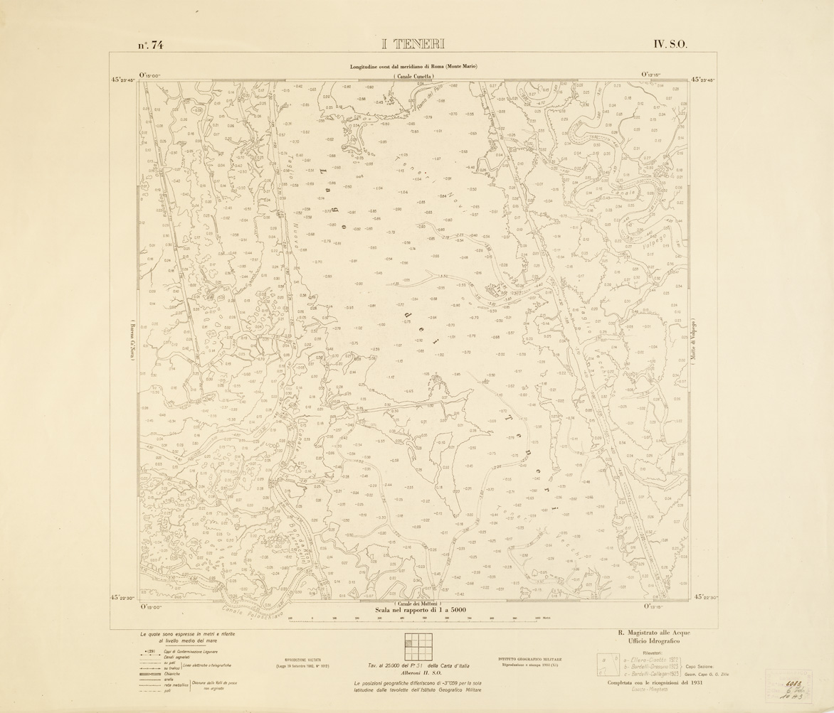 "Documento composto da n. 134 fogli, ma esistenti n. 133 (manca il n.64). Dei fogli n.60 e n. 71 esistono due copie. Rappresentazione orografica planimetrica. Aut. R. Magistrato alle acque - Ufficio Idrografico. Ed. I.G.M. (FI)"