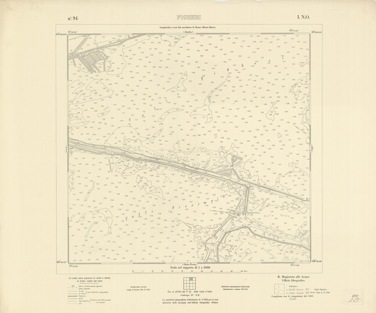"Documento composto da n. 134 fogli, ma esistenti n. 133 (manca il n.64). Dei fogli n.60 e n. 71 esistono due copie. Rappresentazione orografica planimetrica. Aut. R. Magistrato alle acque - Ufficio Idrografico. Ed. I.G.M. (FI)"