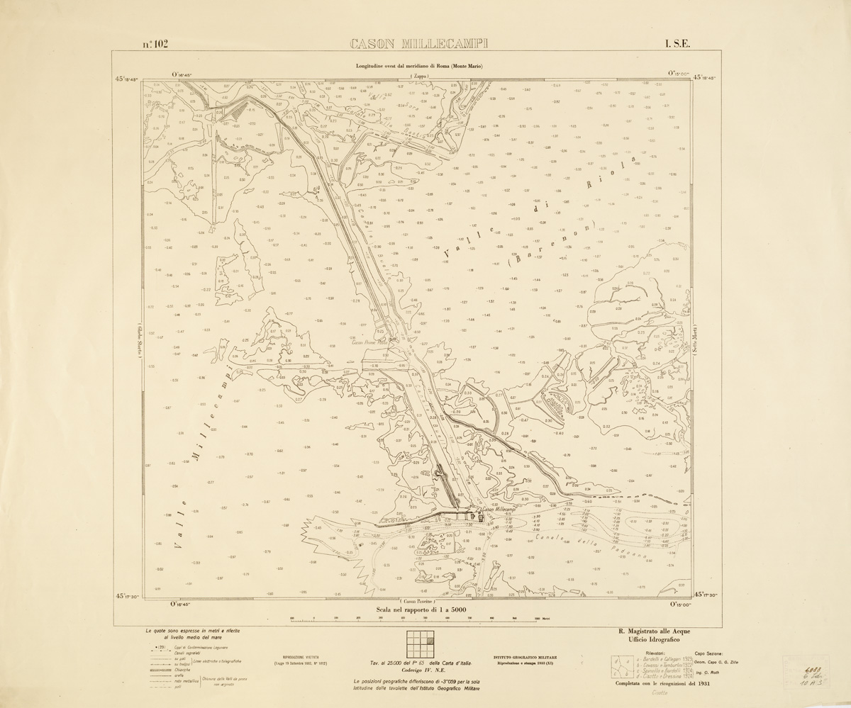 "Documento composto da n. 134 fogli, ma esistenti n. 133 (manca il n.64). Dei fogli n.60 e n. 71 esistono due copie. Rappresentazione orografica planimetrica. Aut. R. Magistrato alle acque - Ufficio Idrografico. Ed. I.G.M. (FI)"