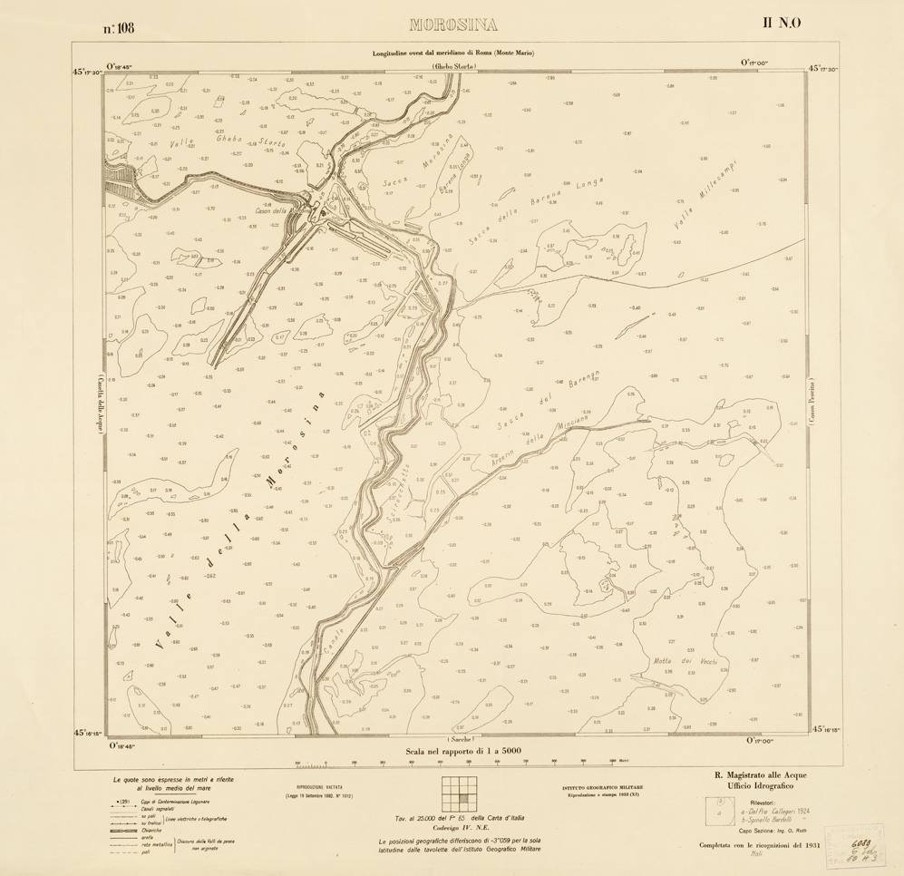 "Documento composto da n. 134 fogli, ma esistenti n. 133 (manca il n.64). Dei fogli n.60 e n. 71 esistono due copie. Rappresentazione orografica planimetrica. Aut. R. Magistrato alle acque - Ufficio Idrografico. Ed. I.G.M. (FI)"