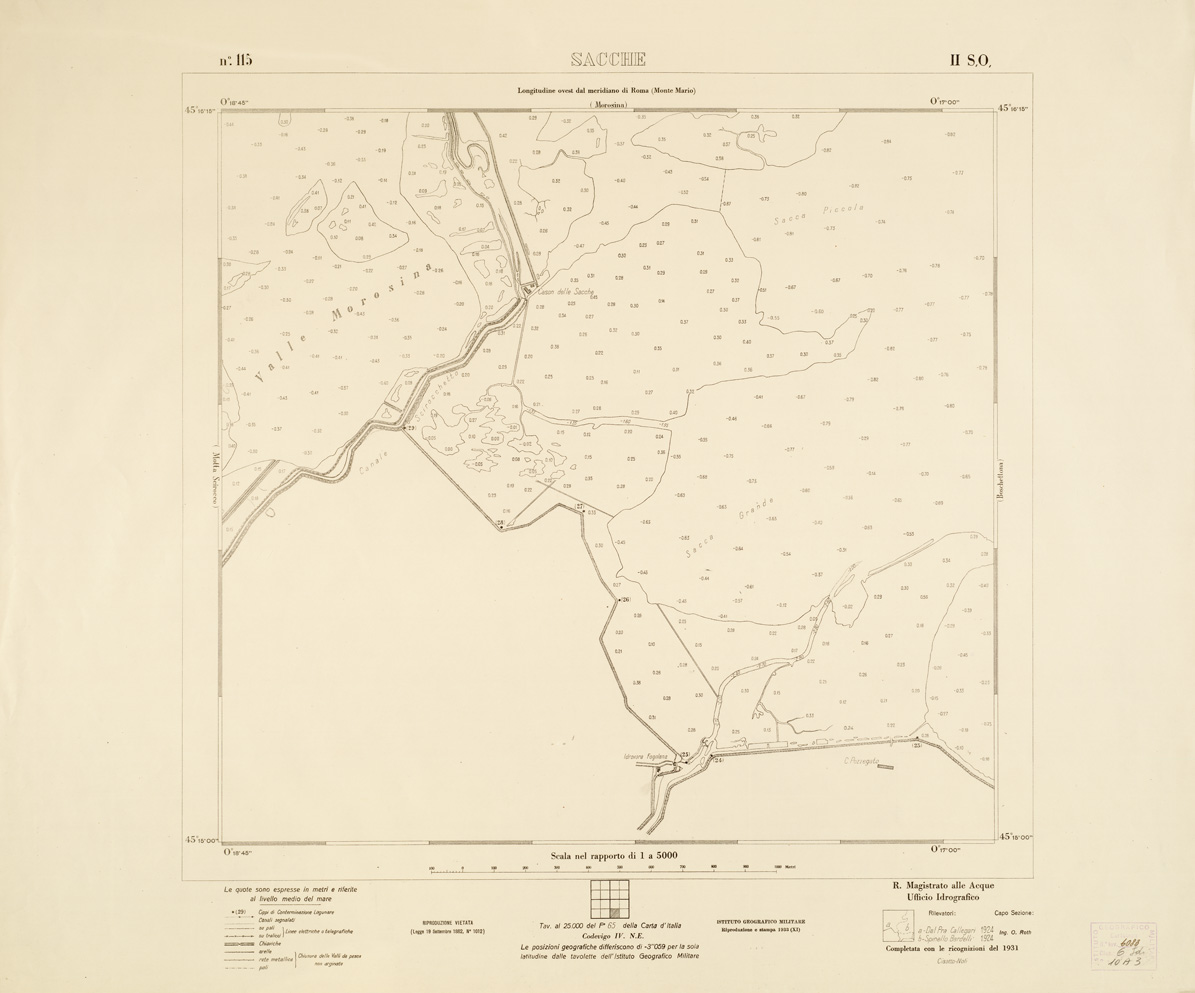 "Documento composto da n. 134 fogli, ma esistenti n. 133 (manca il n.64). Dei fogli n.60 e n. 71 esistono due copie. Rappresentazione orografica planimetrica. Aut. R. Magistrato alle acque - Ufficio Idrografico. Ed. I.G.M. (FI)"