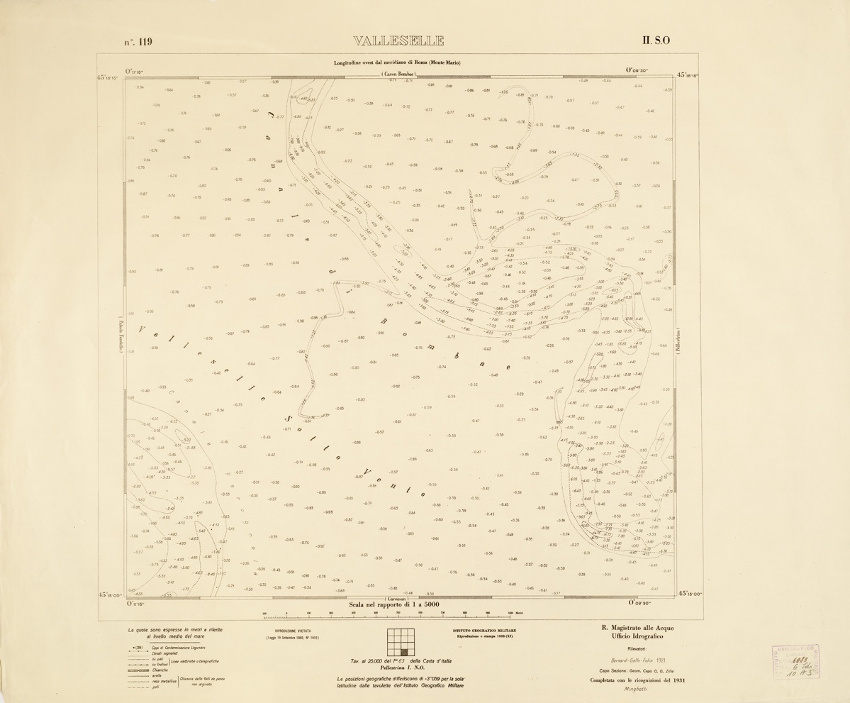 "Documento composto da n. 134 fogli, ma esistenti n. 133 (manca il n.64). Dei fogli n.60 e n. 71 esistono due copie. Rappresentazione orografica planimetrica. Aut. R. Magistrato alle acque - Ufficio Idrografico. Ed. I.G.M. (FI)"