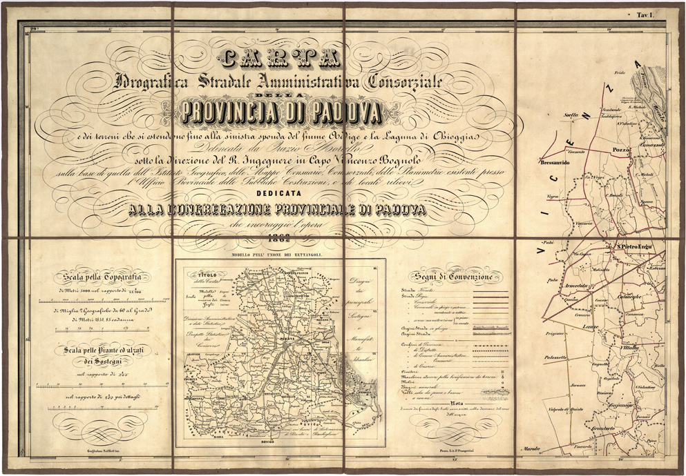 "...E DEI TERRENI CHE SI ESTENDONO FINO ALLA SINISTRA SPONDA DEL FIUME ADIGE E LA LAGUNA DI CHIOGGA. DELINEATA DA ORAZIO MORELLO SOTTO LA DIREZIONE DEL R. INGEGNERE IN CAPO VINCENZO BOGNOLO SULLA BASE DI QUELLA DELL' IST. GEOGRAFICO DELLE MAPPE CENSUARIE, CONSORZIALI, DELLE PLANIMETRIE ESISTENTI PRESSO L' UFFICIO PROVINCIALE DELLE PUBBLICHE COSTRUZIONI, E DI LOCALI RILIEVI. DEDICATA ALLA CONGREGAZIONE PROVINCIALE DI PADOVA CHE INCORAGGIO' L' OPERA - 1862. La scala delle piante e degli alzati dei sostegni è 1:500. Inc. Guglielmo Seiffert. - Prem. Lit. P. Prosperini. Al n. 141 d'ordine - Cart. Arch. n. 59 - Docum. n. 31 e in appartenenza alla Biblioteca con il numero d' inventario 124 c'è la seconda edizione di questa carta alla scala di 1:50.000 del 1882."