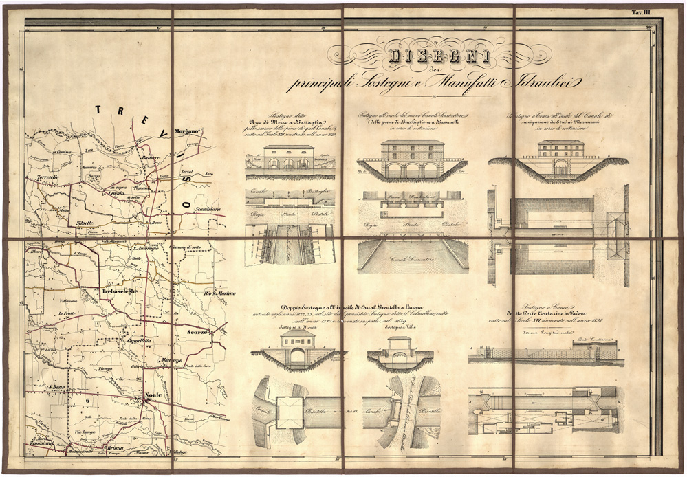 "...E DEI TERRENI CHE SI ESTENDONO FINO ALLA SINISTRA SPONDA DEL FIUME ADIGE E LA LAGUNA DI CHIOGGA. DELINEATA DA ORAZIO MORELLO SOTTO LA DIREZIONE DEL R. INGEGNERE IN CAPO VINCENZO BOGNOLO SULLA BASE DI QUELLA DELL' IST. GEOGRAFICO DELLE MAPPE CENSUARIE, CONSORZIALI, DELLE PLANIMETRIE ESISTENTI PRESSO L' UFFICIO PROVINCIALE DELLE PUBBLICHE COSTRUZIONI, E DI LOCALI RILIEVI. DEDICATA ALLA CONGREGAZIONE PROVINCIALE DI PADOVA CHE INCORAGGIO' L' OPERA - 1862. Disegni dei principali sostegni e manufatti idraulici. La scala delle piante e degli alzati dei sostegni è 1:500. Inc. Guglielmo Seiffert. - Prem. Lit. P. Prosperini. Al n. 141 d'ordine - Cart. Arch. n. 59 - Docum. n. 31 e in appartenenza alla Biblioteca con il numero d' inventario 124 c'è la seconda edizione di questa carta alla scala di 1:50.000 del 1882."