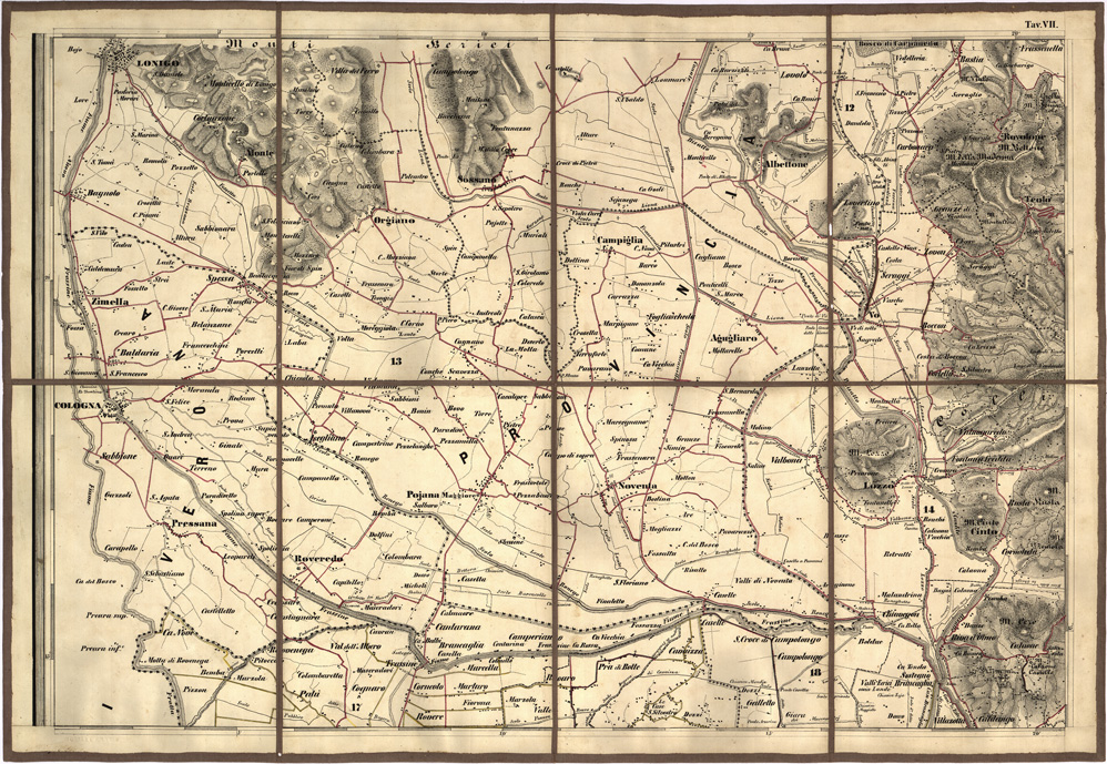 "...E DEI TERRENI CHE SI ESTENDONO FINO ALLA SINISTRA SPONDA DEL FIUME ADIGE E LA LAGUNA DI CHIOGGA. DELINEATA DA ORAZIO MORELLO SOTTO LA DIREZIONE DEL R. INGEGNERE IN CAPO VINCENZO BOGNOLO SULLA BASE DI QUELLA DELL' IST. GEOGRAFICO DELLE MAPPE CENSUARIE, CONSORZIALI, DELLE PLANIMETRIE ESISTENTI PRESSO L' UFFICIO PROVINCIALE DELLE PUBBLICHE COSTRUZIONI, E DI LOCALI RILIEVI. DEDICATA ALLA CONGREGAZIONE PROVINCIALE DI PADOVA CHE INCORAGGIO' L' OPERA - 1862. La scala delle piante e degli alzati dei sostegni è 1:500. Inc. Guglielmo Seiffert. - Prem. Lit. P. Prosperini. Al n. 141 d'ordine - Cart. Arch. n. 59 - Docum. n. 31 e in appartenenza alla Biblioteca con il numero d' inventario 124 c'è la seconda edizione di questa carta alla scala di 1:50.000 del 1882."