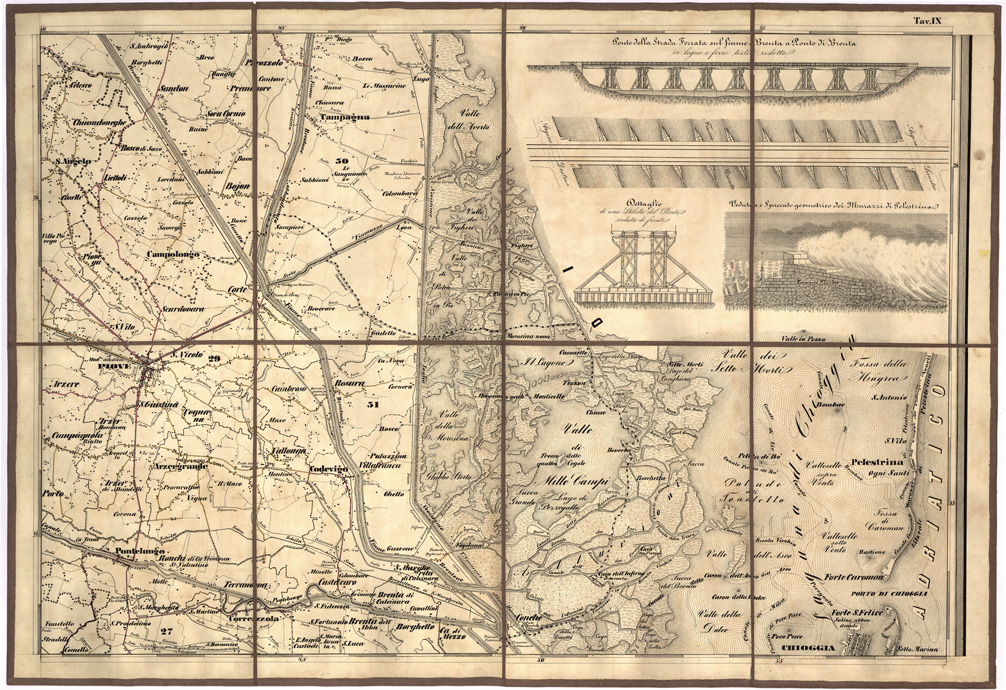 "...E DEI TERRENI CHE SI ESTENDONO FINO ALLA SINISTRA SPONDA DEL FIUME ADIGE E LA LAGUNA DI CHIOGGA. DELINEATA DA ORAZIO MORELLO SOTTO LA DIREZIONE DEL R. INGEGNERE IN CAPO VINCENZO BOGNOLO SULLA BASE DI QUELLA DELL' IST. GEOGRAFICO DELLE MAPPE CENSUARIE, CONSORZIALI, DELLE PLANIMETRIE ESISTENTI PRESSO L' UFFICIO PROVINCIALE DELLE PUBBLICHE COSTRUZIONI, E DI LOCALI RILIEVI. DEDICATA ALLA CONGREGAZIONE PROVINCIALE DI PADOVA CHE INCORAGGIO' L' OPERA - 1862. Prospetto del ponte sul fiume Brenta a Lonte di Brenta e dei Murazzi di Palestrina. La scala delle piante e degli alzati dei sostegni è 1:500. Inc. Guglielmo Seiffert. - Prem. Lit. P. Prosperini. Al n. 141 d'ordine - Cart. Arch. n. 59 - Docum. n. 31 e in appartenenza alla Biblioteca con il numero d' inventario 124 c'è la seconda edizione di questa carta alla scala di 1:50.000 del 1882."