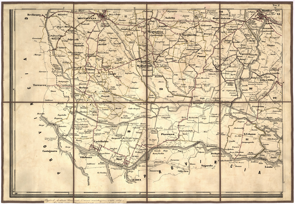 "...E DEI TERRENI CHE SI ESTENDONO FINO ALLA SINISTRA SPONDA DEL FIUME ADIGE E LA LAGUNA DI CHIOGGA. DELINEATA DA ORAZIO MORELLO SOTTO LA DIREZIONE DEL R. INGEGNERE IN CAPO VINCENZO BOGNOLO SULLA BASE DI QUELLA DELL' IST. GEOGRAFICO DELLE MAPPE CENSUARIE, CONSORZIALI, DELLE PLANIMETRIE ESISTENTI PRESSO L' UFFICIO PROVINCIALE DELLE PUBBLICHE COSTRUZIONI, E DI LOCALI RILIEVI. DEDICATA ALLA CONGREGAZIONE PROVINCIALE DI PADOVA CHE INCORAGGIO' L' OPERA - 1862. La scala delle piante e degli alzati dei sostegni è 1:500. Inc. Guglielmo Seiffert. - Prem. Lit. P. Prosperini. Al n. 141 d'ordine - Cart. Arch. n. 59 - Docum. n. 31 e in appartenenza alla Biblioteca con il numero d' inventario 124 c'è la seconda edizione di questa carta alla scala di 1:50.000 del 1882."