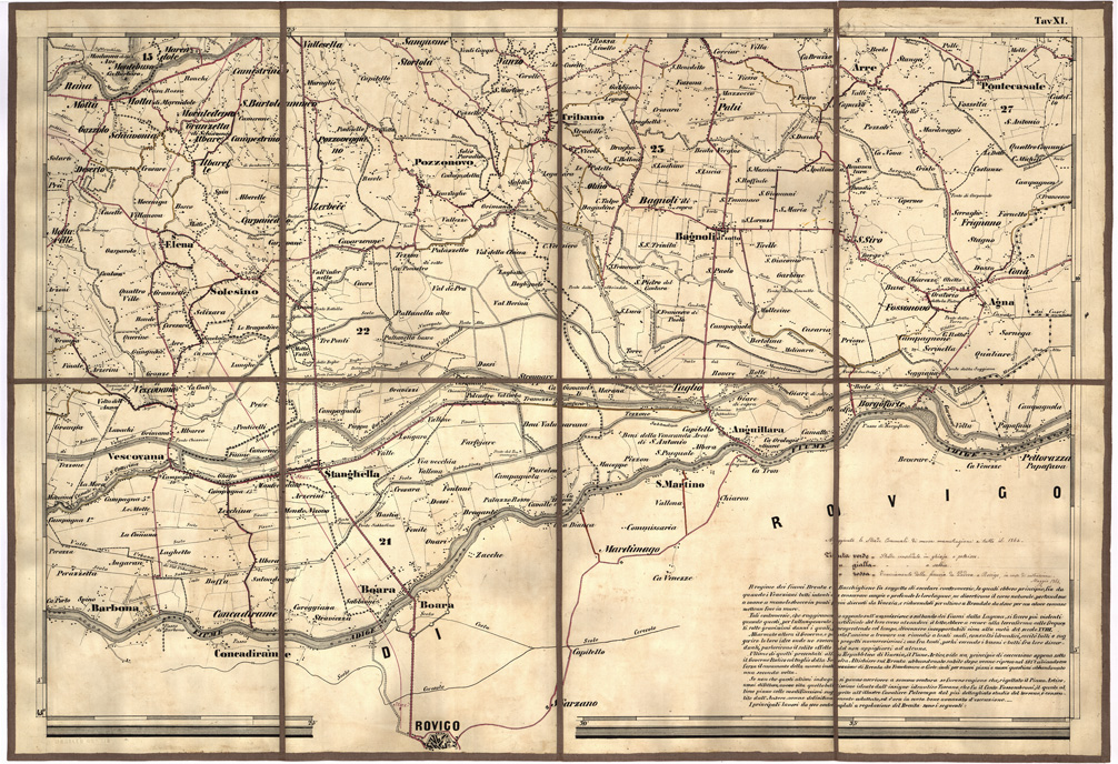 "...E DEI TERRENI CHE SI ESTENDONO FINO ALLA SINISTRA SPONDA DEL FIUME ADIGE E LA LAGUNA DI CHIOGGA. DELINEATA DA ORAZIO MORELLO SOTTO LA DIREZIONE DEL R. INGEGNERE IN CAPO VINCENZO BOGNOLO SULLA BASE DI QUELLA DELL' IST. GEOGRAFICO DELLE MAPPE CENSUARIE, CONSORZIALI, DELLE PLANIMETRIE ESISTENTI PRESSO L' UFFICIO PROVINCIALE DELLE PUBBLICHE COSTRUZIONI, E DI LOCALI RILIEVI. DEDICATA ALLA CONGREGAZIONE PROVINCIALE DI PADOVA CHE INCORAGGIO' L' OPERA - 1862. A lato dicitura sulle controversie riguardanti i fiumi Brenta e Bacchiglione. La scala delle piante e degli alzati dei sostegni è 1:500. Inc. Guglielmo Seiffert. - Prem. Lit. P. Prosperini. Al n. 141 d'ordine - Cart. Arch. n. 59 - Docum. n. 31 e in appartenenza alla Biblioteca con il numero d' inventario 124 c'è la seconda edizione di questa carta alla scala di 1:50.000 del 1882."