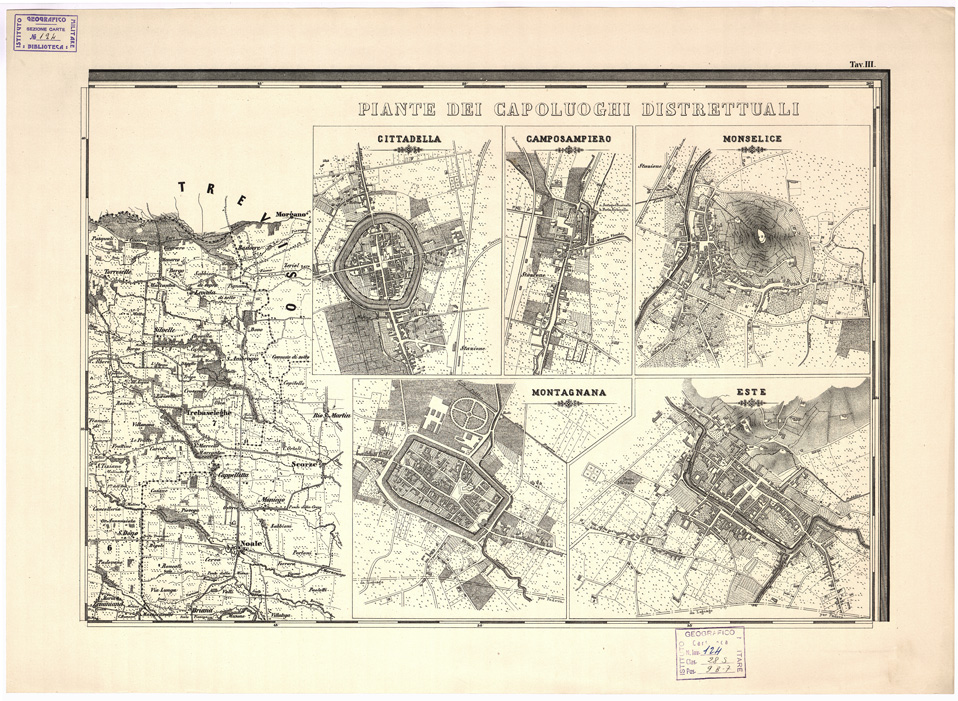 "... DEI TERRENI CHE SI ESTENDONO FINO ALLA SINISTRA SPONDA DEL FIUME ADIGE E LA LAGUNA DI CHIOGGA. DELINEATA DA ORAZIO MORELLI. IIa EDIZIONE RIDOTTA ALLA SCALA DI 1:50.000. RIVEDUTA, CORRETTA E COMPLETATA COLLA INDICAZIONE DELLE COLTIVAZIONI E DELLE ALTEZZE DEL PIANO CAMPAGNA SUL LIVELLO DEL MARE E COLLE PIANTE DEI CAPOLUOGHI DISTRETTUALI. DEDICATA ALLA DEPUTAZIONE PROVINCIALE DI PADOVA CHE INCORAGGIO' L' OPERA - 1882. Piante dei capoluoghi distrettuali: Cittadella-Camposanpiero-Monselice-Este-Montagnana La stessa carta si può trovare: nella Ia edizione del 1862 alla scala 1:43.200 al numero d' inventario 5824 in appartenenza alla Biblioteca e in appartenenza all' Archivio Cartografico al n. 141 d'ordine - Cart. Arch. n. 59 - Docum. n. 31 alla scala 1:50.000 del 1882. "
