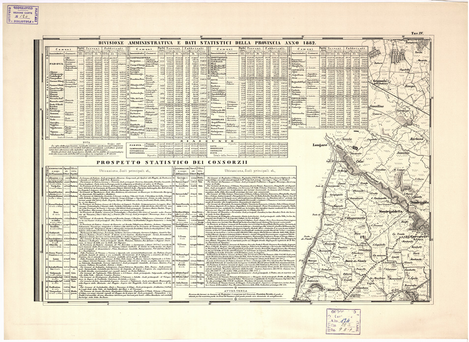 "... DEI TERRENI CHE SI ESTENDONO FINO ALLA SINISTRA SPONDA DEL FIUME ADIGE E LA LAGUNA DI CHIOGGA. DELINEATA DA ORAZIO MORELLI. IIa EDIZIONE RIDOTTA ALLA SCALA DI 1:50.000. RIVEDUTA, CORRETTA E COMPLETATA COLLA INDICAZIONE DELLE COLTIVAZIONI E DELLE ALTEZZE DEL PIANO CAMPAGNA SUL LIVELLO DEL MARE E COLLE PIANTE DEI CAPOLUOGHI DISTRETTUALI. DEDICATA ALLA DEPUTAZIONE PROVINCIALE DI PADOVA CHE INCORAGGIO' L' OPERA - 1882. Divisione amministrativa e dati statistici della provincia anno 1882 - Prospetto statistico dei consorzi La stessa carta si può trovare: nella Ia edizione del 1862 alla scala 1:43.200 al numero d' inventario 5824 in appartenenza alla Biblioteca e in appartenenza all' Archivio Cartografico al n. 141 d'ordine - Cart. Arch. n. 59 - Docum. n. 31 alla scala 1:50.000 del 1882."