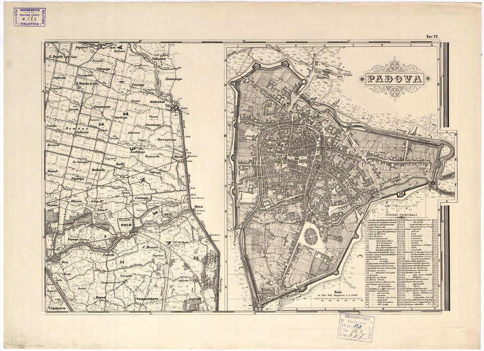 "... DEI TERRENI CHE SI ESTENDONO FINO ALLA SINISTRA SPONDA DEL FIUME ADIGE E LA LAGUNA DI CHIOGGA. DELINEATA DA ORAZIO MORELLI. IIa EDIZIONE RIDOTTA ALLA SCALA DI 1:50.000. RIVEDUTA, CORRETTA E COMPLETATA COLLA INDICAZIONE DELLE COLTIVAZIONI E DELLE ALTEZZE DEL PIANO CAMPAGNA SUL LIVELLO DEL MARE E COLLE PIANTE DEI CAPOLUOGHI DISTRETTUALI. DEDICATA ALLA DEPUTAZIONE PROVINCIALE DI PADOVA CHE INCORAGGIO' L' OPERA - 1882. Pianta della città di Padova alla scala di 1:10.000 La stessa carta si può trovare: nella Ia edizione del 1862 alla scala 1:43.200 al numero d' inventario 5824 in appartenenza alla Biblioteca e in appartenenza all' Archivio Cartografico al n. 141 d'ordine - Cart. Arch. n. 59 - Docum. n. 31 alla scala 1:50.000 del 1882."