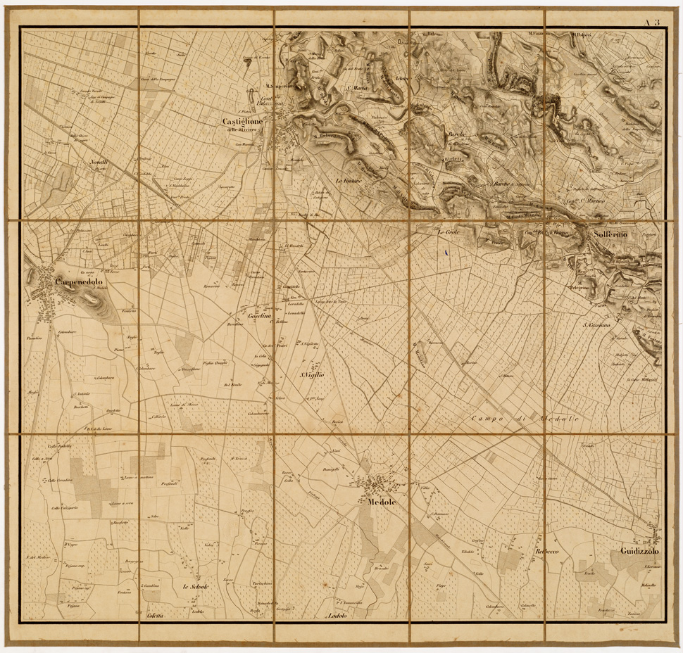 "...GRAVEE SUR PIERRE PAR REGNIER ET DOURDET, ECC. PARIS, 1851. LITH. DE GRATIA, A PARIS. Carta in 11 fogli stampati in nero. Il foglio DI contiene il titolo, il quadro d' unione, la legenda dei segni convenzionali e le scale grafiche. L' orografia è rappresentata col tratteggio a luce zenitale. Gli abitati sono distinti in base alla loro importanza amministrativa. Le strade sono distinte in 7 classi. Sono pure mostrati i vari tipi di vegetazione e colture. Annesse 2 copie - di appartenenza alla Biblioteca - su carta vegetale dell' ingrandimento al 10.000 del foglio DII Verona datate 1880. La stessa carta è in appartenenza anche all' Archivio Cartografico (n. d' ordine 104 - Cart. d' arch. n. 60 - Docum. 47 bis. - file A000999-1009)."