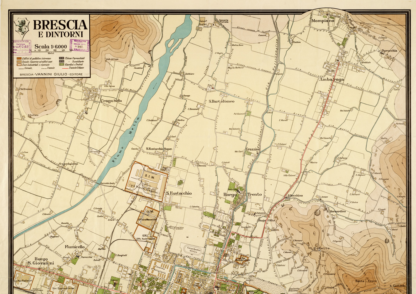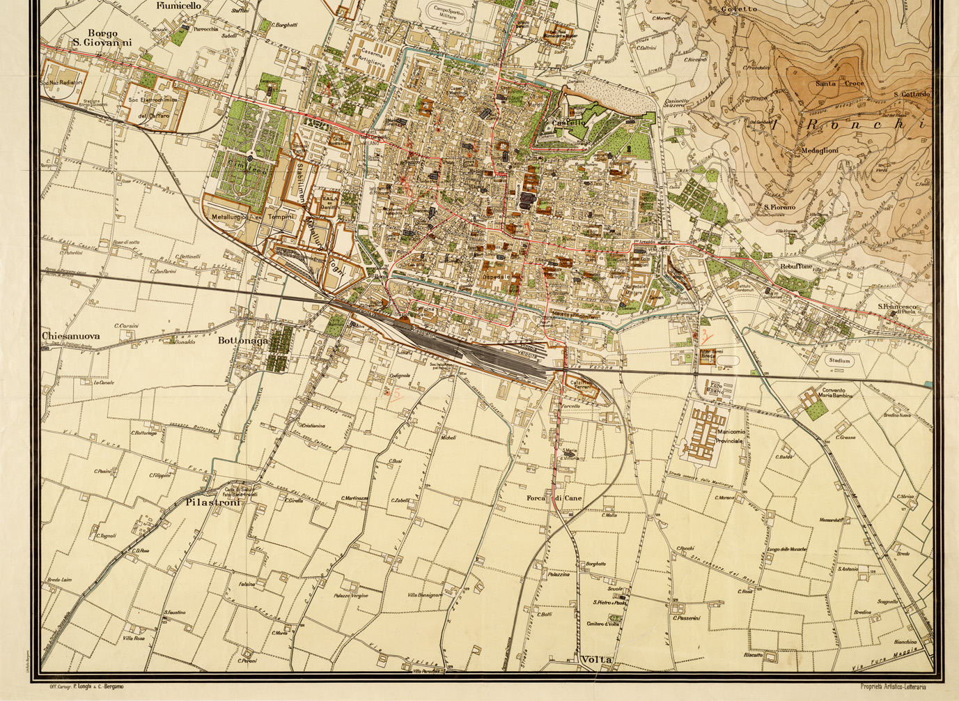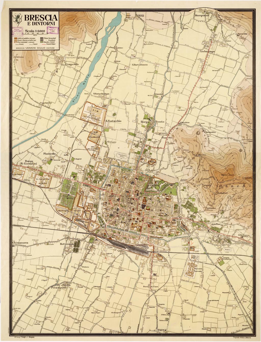 "VANNINI GIULIO, 1927. Off. Cart. P.Longhi & C. Bergamo. Un foglio a colori con rilievo orografico dimostrato a tinte ipsometriche e curve di livello tracciate di 25 in 25 m., acque in azzurro, vegetazione in verde, edifici civili in marrone, edifici religiosi in viola, ferrovie e tramvie in nero, tramvie urbane in rosso."