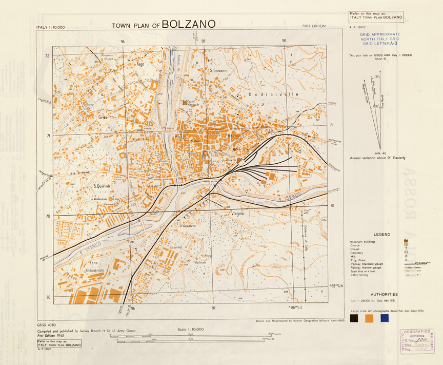 "Rappresentazione orografica planimetrica. Ed. I.G.M. (FI) - Compilata e pubblicata da Survey Branch H Q 15 Army Group - Ia edizione."