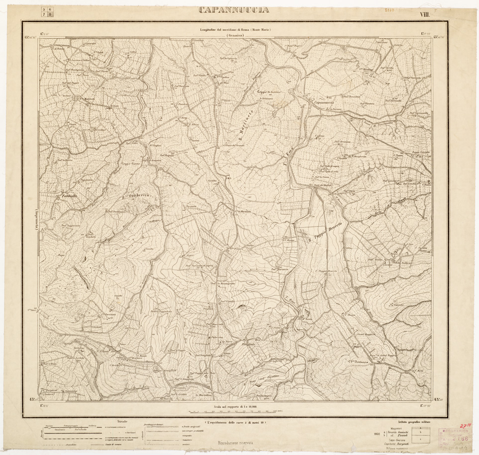 "I.G.M. Epoca 1896-97. Scala 1:10.000. Otto fogli stampati in nero con orografia a curve di livello tracciate alla equidistanza di 100m. In basso, su ciascun foglio, la leggenda dei segni convenzionali. La stessa carta si può trovare in edizioni diverse : inv. n. 2732 del 1923 (B0006382-B0006387) e inv. n. 5924 del 1938 (B0006370-B0006373). Le copie hanno riportato in rosso alcuni elementi."