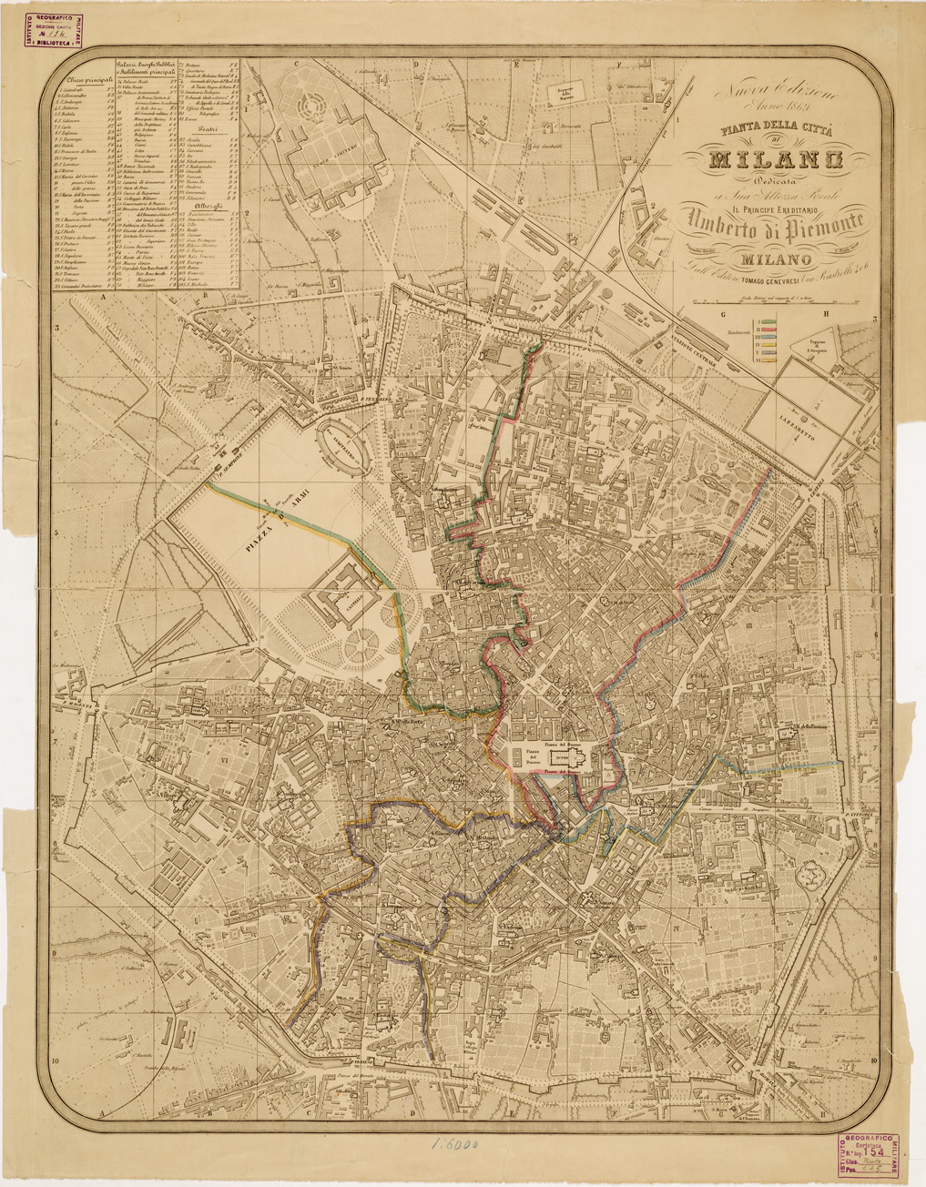 NUOVA EDIZIONE ANNO 1869.PIANTA DELLA CITTA' DI MILANO DEDICATA A SUA ALTEZZA REALE IL PRINCIPE EREDITARIO UMBERTO DI PIEMONTE. MILANO, DALL'EDITORE TOMASO GENEVRESI