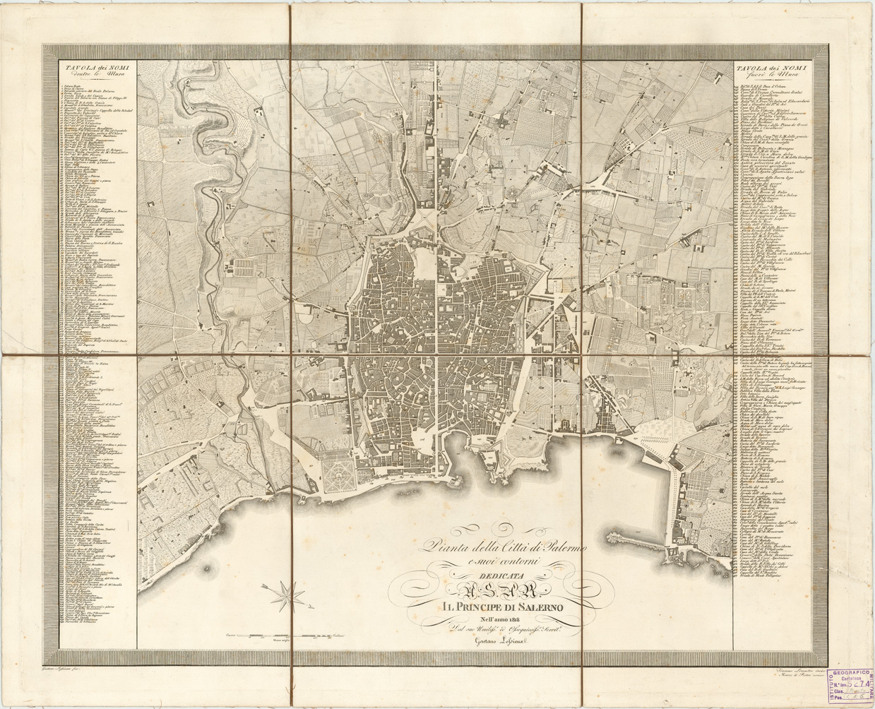 "Foglio unico montato su tela, tratto da incisione su rame eseguita da T. Lomastro con scritture di Marco di Pietro. Bella pianta corredata di ricco elenco numerico delle costruzioni, vie, piazze, ecc.. La scala grafica è calcolata in miglia siciliane. Stessa carta in appartenenza all'Archivio Topografico corrispondente al Docum. n. 19, cart. d'Arch. 88, Num. d'Ordine 26, File A0002643. Cfr. anche l'edizione del 1865 al numero di File B0006413."