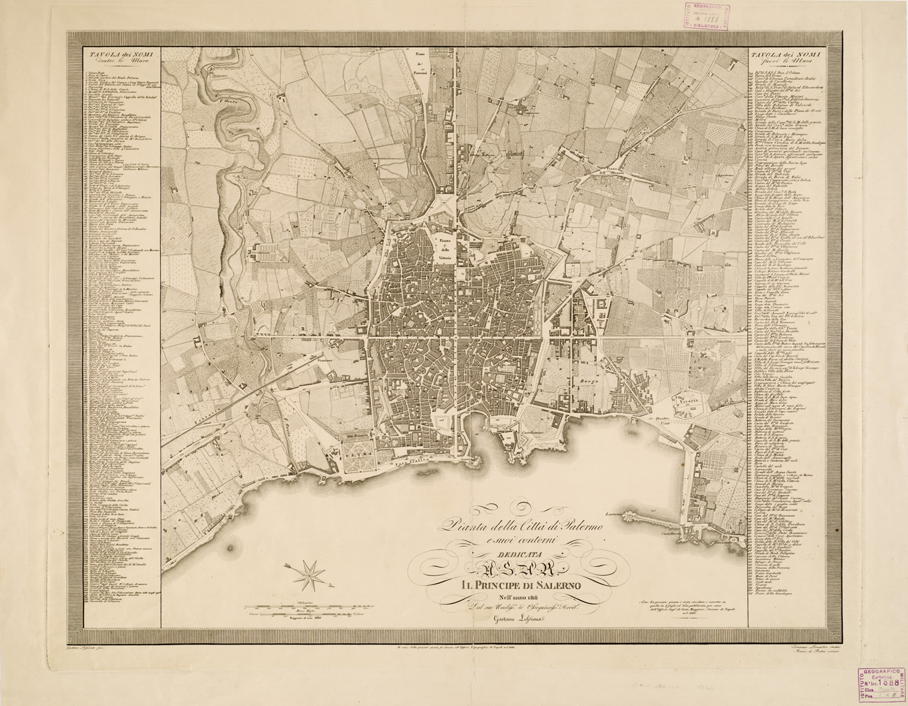 PIANTA DELLA CITTA' DI PALERMO E SUOI CONTORNI DEDICATA A S.A.R. IL PRINCIPE DI SALERNO. NELL'ANNO 1818. DAL SUO UMILISSIMO ED OSSEQUOSISSIMO SERVITORE GAETANO LOSSIEUX, ECC.