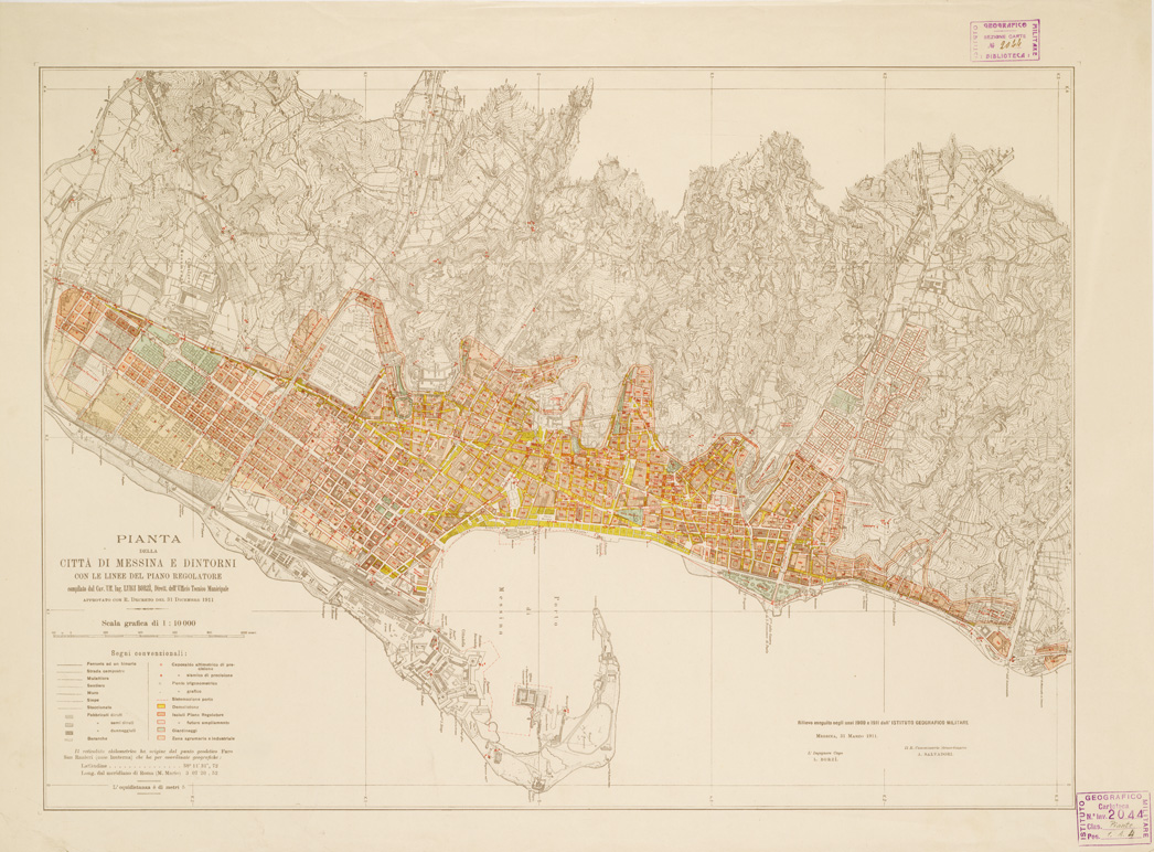 "Rappresentazione orografica a curve di livello. Aut. L. Borzi. Ed. Uff. Tecnico del Municipio di Mesina. Il rilievo è stato eseguito negli anni 1909-1911 dall' Ist. Geog. Militare. Confronta anche il documento al numero d' inventario 2044 Bis."
