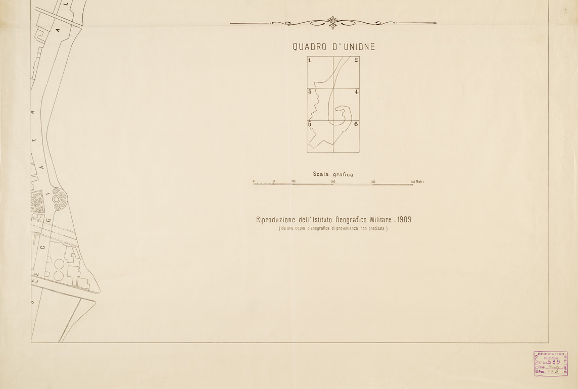 "Scala 1:2.000. Dimensioni m.0,65x0,80 (margine riquadro) per foglio. Riproduzione in 6 fogli eseguita dall' I.G.M. di Firenze nel 1909 tratta da una copia cianografica di provenienza non precisata."