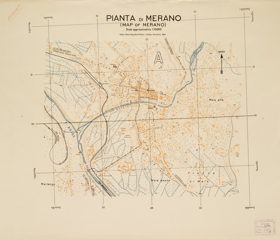 "Rappresentazione orografica planimetrica. Ed. I.G.M. (FI). La scala 1:10.000 è approssimativa. Con lo stesso numero d' inventario "Town plan of Merano " edizione del 1945."