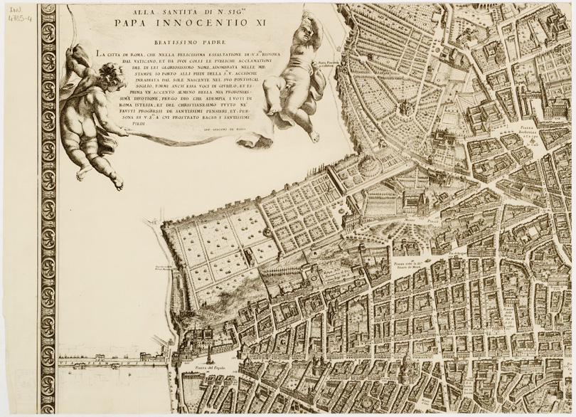 "CON TUTTE LE STRADE LE PIAZZE ET EDIFICII DE TEMPII PALAZZI GIARDINI ET ALTRE FABBRICHE ANTICHE E MODERNE COME SI TROVANO AL PRESENTE NEL PONTIFICATO DI N. S. PAPA INNOCENTIO XI. DISEGNIATA ET INTAGLIATA DA GIO. BATTISTA FALDA DA VALDUGGIA ET DATO AL PUBBLICO DA GIO. GIACOMO DE ROSSI DALLE SUE STAMPE IN ROMA ALLA PACE L' ANNO 1679. Riproduzione a cura della Biblioteca Vaticana (" Le Piante Maggiori di Roma dei secoli XVI e XVIII, riprodotte in fototipia a cura della Biblioteca Vaticana, in 12 fogli, tratta da l' originale pure in 12 fogli di cm.37x48. E' accompagnata da un testo illustrativo con ampie notizie su l' autore e il contenuto della pianta, le varie edizioni di essa, ecc., l' elenco dei nomi e la trascrizione delle leggende. La pianta è a proiezione verticale con elevazione. E' corredata da una cartina dell' agro romano e di vedute. "
